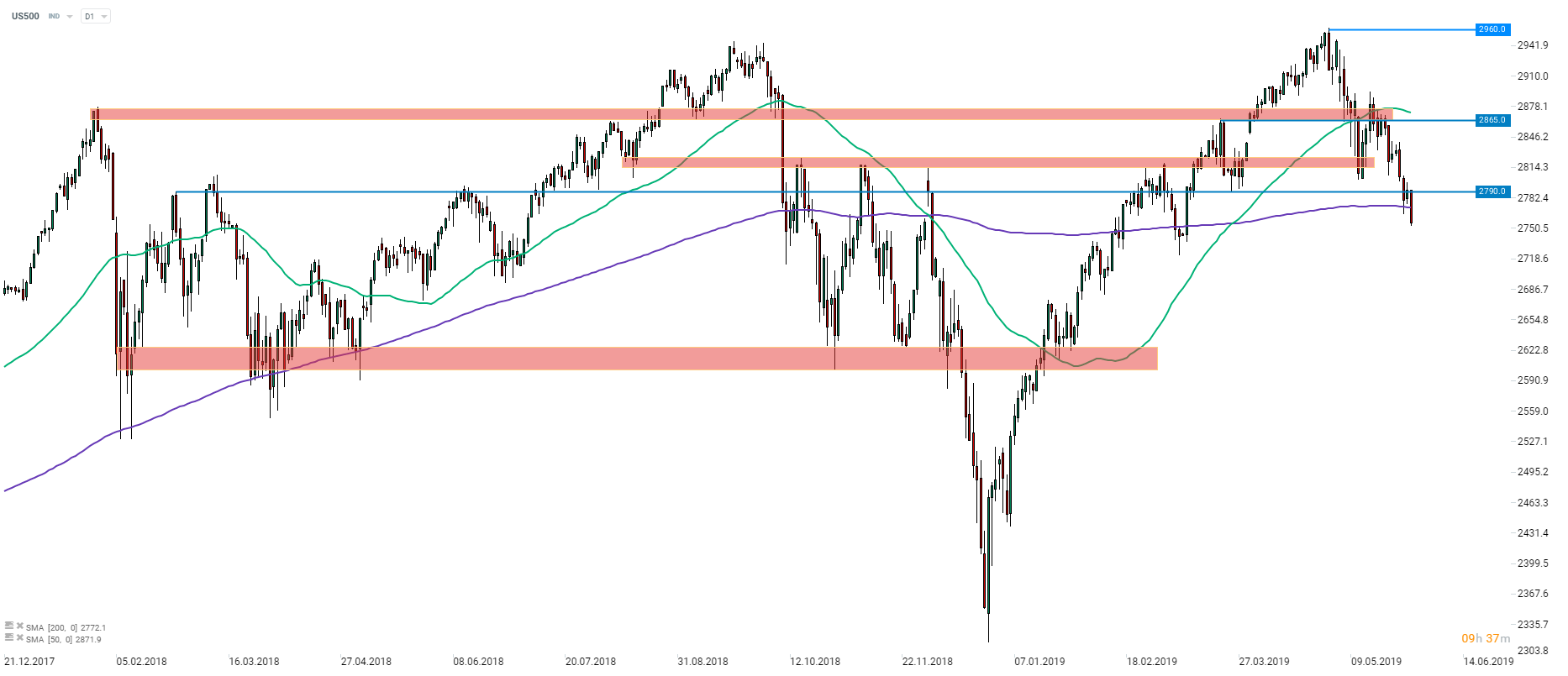 Des données contrastées et l'ouverture d'un nouveau chapitre dans les relations commerciales entre les États-Unis et le Mexique ont amené le S & P 500 (US500) à se situer sous la moyenne mobile à 200 sessions pour la première fois depuis le 7 mars. Source: xStation5