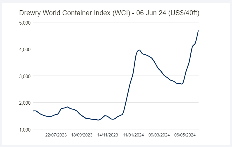 Les taux de fret ont été multipliés par plusieurs fois par rapport aux niveaux de l'automne 2023. Source: Drewry
