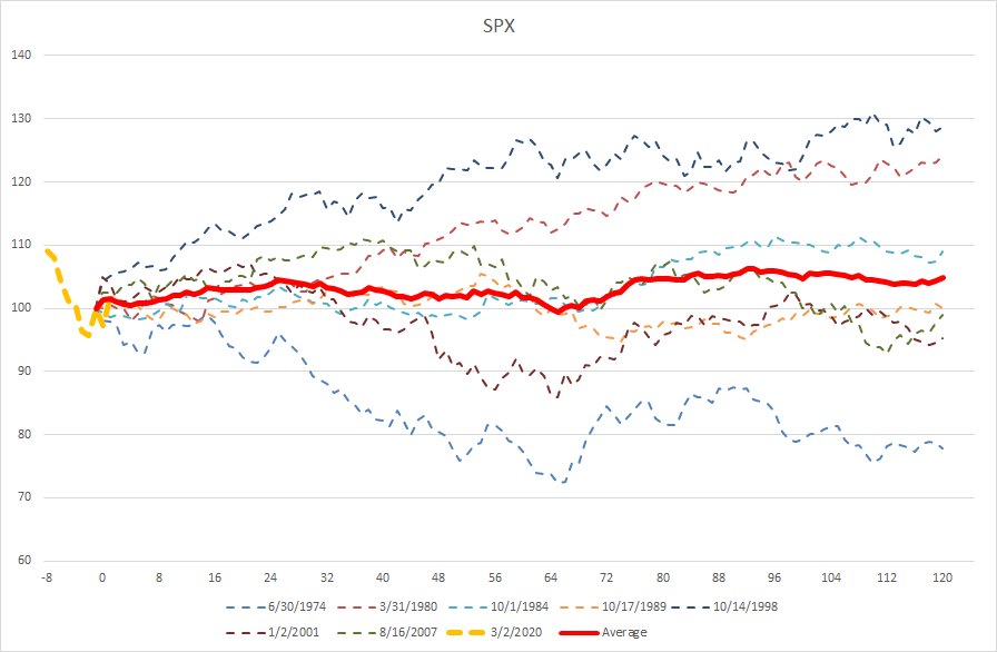 Ce n'est pas la première fois que la Fed procède à une intervention d'urgence ou à une réduction démesurée. Éclatement de la bulle internet, effondrement de LTCM, crise bancaire - nous avons vu ces actions à de nombreuses reprises. Cela nous permet de suivre les réactions du marché à ces actions. Nous avons sélectionné 7 réponses de ce type au cours des 50 dernières années. Il y en a eu d'autres, mais comme certaines actions extraordinaires se sont produites plusieurs fois au cours d'une même crise (par exemple, 3 fois pendant la crise financière mondiale), nous n'avons choisi que la première réponse car c'est aussi la première fois que la Fed prend une telle décision. Quels sont les résultats ? C'est assez étrange. Le premier mois se traduit par un gain moyen de 1 % pour l'indice S&P500 (500 dollars US), les traders se félicitant de la relance. Les trois premiers mois ont un rendement négatif de 1,25 %, ce qui signifie que le problème s'est réglé et que la première réaction a été plus qu'inversée. Toutefois, le rendement annuel suite à une intervention d’urgence est supérieur à 5 % en moyenne, ce qui laisse penser que l'action a finalement été couronnée de succès