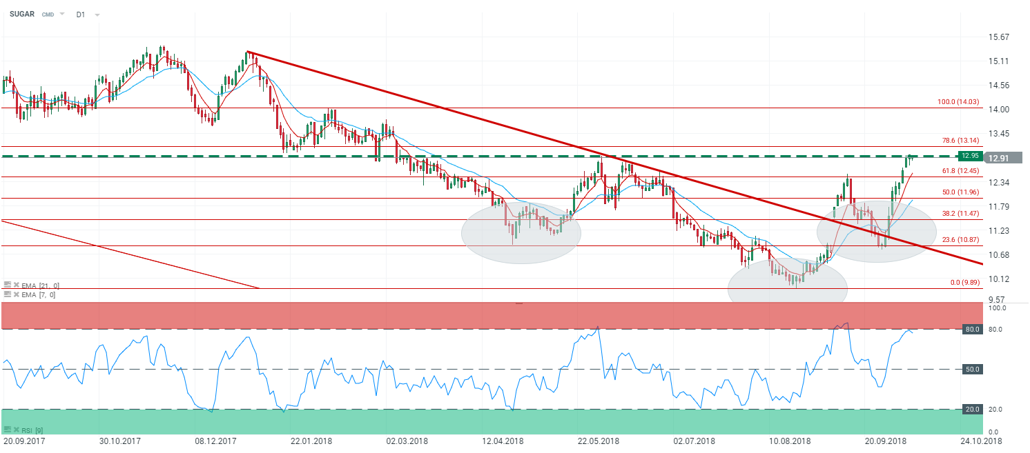 En unité de temps journalière (D1), le sucre (SUGAR) évolue en tendance haussière. Les cours sont portés par les moyennes mobiles à 7 et 21 périodes au-dessus de la zone des 12,45 $ - correspondant aux 61,8 % des retracements de Fibonnaci. Attention cependant au RSI qui évolue sur sa zone de « sur achat » à 77,3 points. Nous pouvons voir une Epaule-Tête-Epaule inversée – bien que l’épaule de gauche soit éloignée de la tête de la figure chartiste. Tout d’abord nous recommandons la prudence sur cet actif qui s’envole de plus de +16,75 % depuis le début du mois d’octobre. Dans ce contexte particulier, nous avons un biais acheteur en cas d’affranchissement de la zone des 12,95 $ / 13 $ avec comme premier objectif conservateur le niveau des 14 $ - puis par extension le retracement de l’Epaule-Tête-Epaule inversée sur le niveau des 16 $.