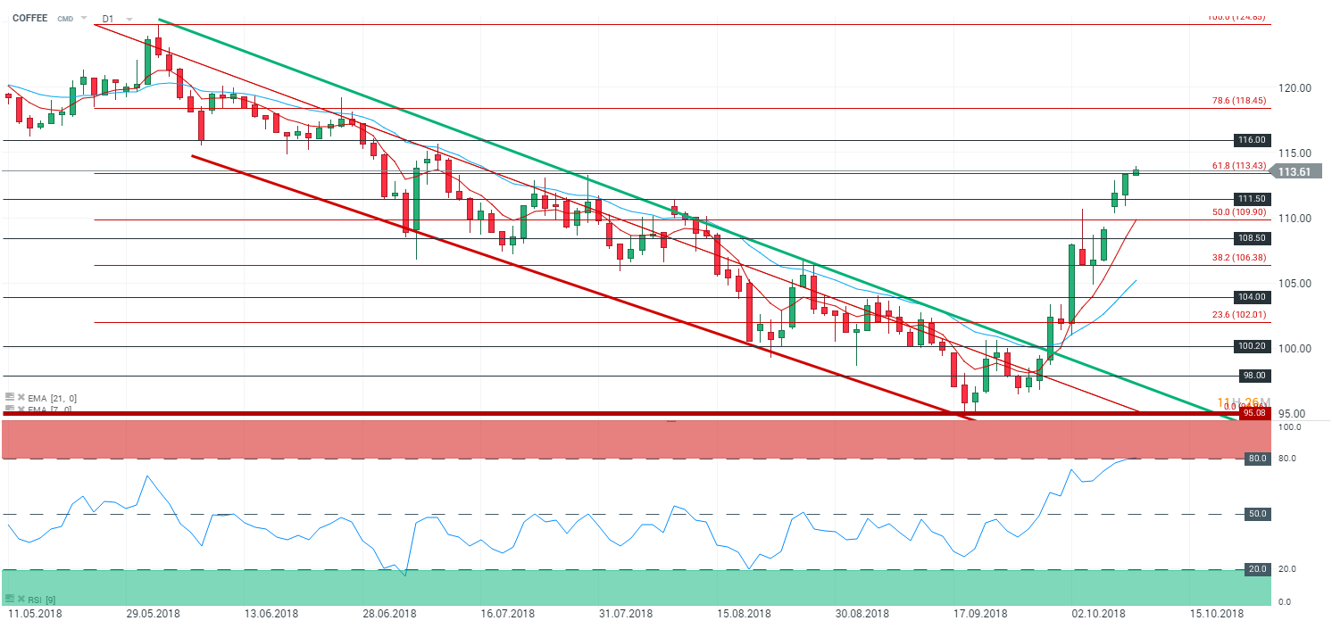 En unité de temps journalière (D1), le café (COFFEE) évolue en tendance haussière. Les cours sont portés par les moyennes mobiles à 7 et 21 périodes au-dessus du seuil des 113,75 $ - correspondant aux 61,8 % des retracements de Fibonnaci. Attention cependant au RSI qui oscille dans sa zone de « sur achat » à 79,8 points. Dans ce contexte, nous privilégions la prudence sur cet actif qui gagne déjà +11,39 % depuis le début de ce mois d’octobre. Cependant, le contexte entourant le Brésil est favorable à une poursuite de cette hausse – avec comme objectif le niveau des 116 $ - puis le niveau des 118,45 $ par extension.