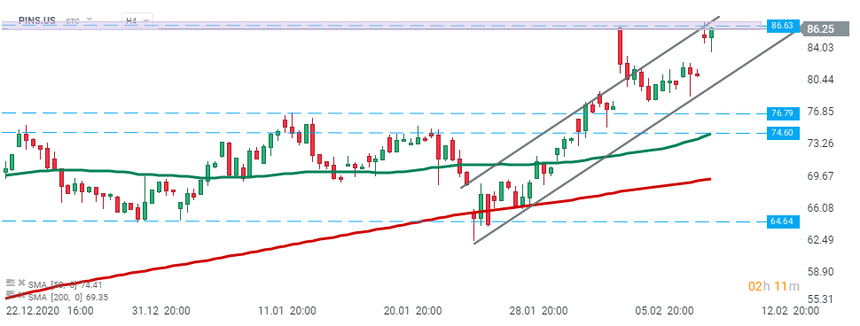 Le titre Pinterest (PINS.US) a lancé la session d'aujourd'hui à la hausse et teste actuellement son record historique autour de 86,63 dollars, qui est en outre renforcé par la limite supérieure du canal ascendant. Le scénario à la hausse sera invalidé si les vendeurs parviennent à reprendre le contrôle et à passer sous la limite inférieure de la formation. Dans un tel scénario, le premier support clé se trouve à 76,79 dollars. Source : xStation5