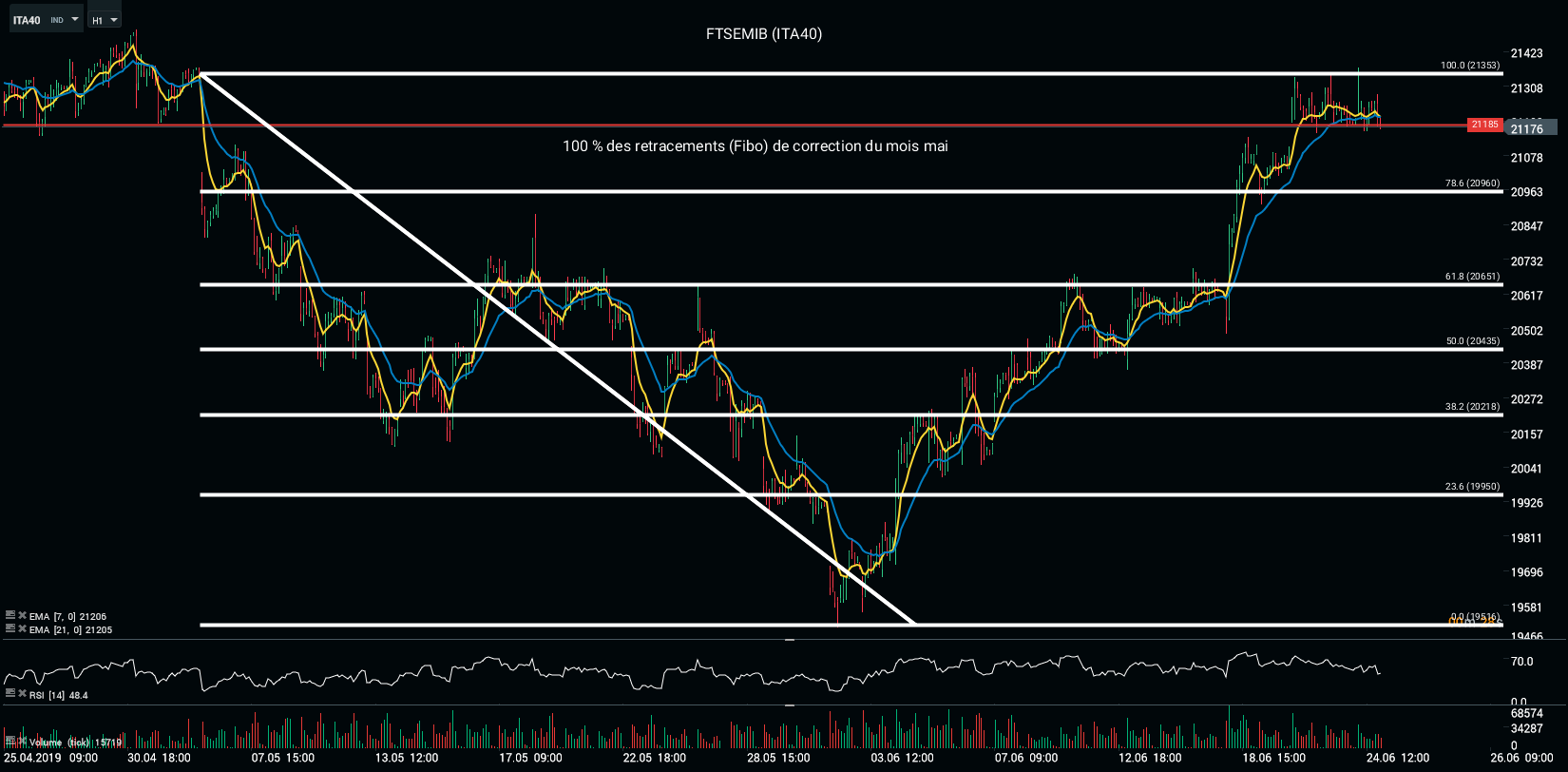Evidemment, au vue de sa configuration nous pourrions penser que ce mini-bot n’est tout simplement qu’une monnaie parallèle crée pour « monétiser » la dette souveraine italienne (ce qui n’est pas possible étant donné que le gouvernement italien n’a pas la mainmise sur sa politique monétaire). Cet épisode s’inscrit dans la énième passe d’armes entre Rome et Bruxelles en ce qui concerne la discipline budgétaire. Pour l’heure, le FTSEMIB tutoie des plus hauts datant de mai 2019. Selon nous, Il serait avisé de rester attentif à l’indice milanais.