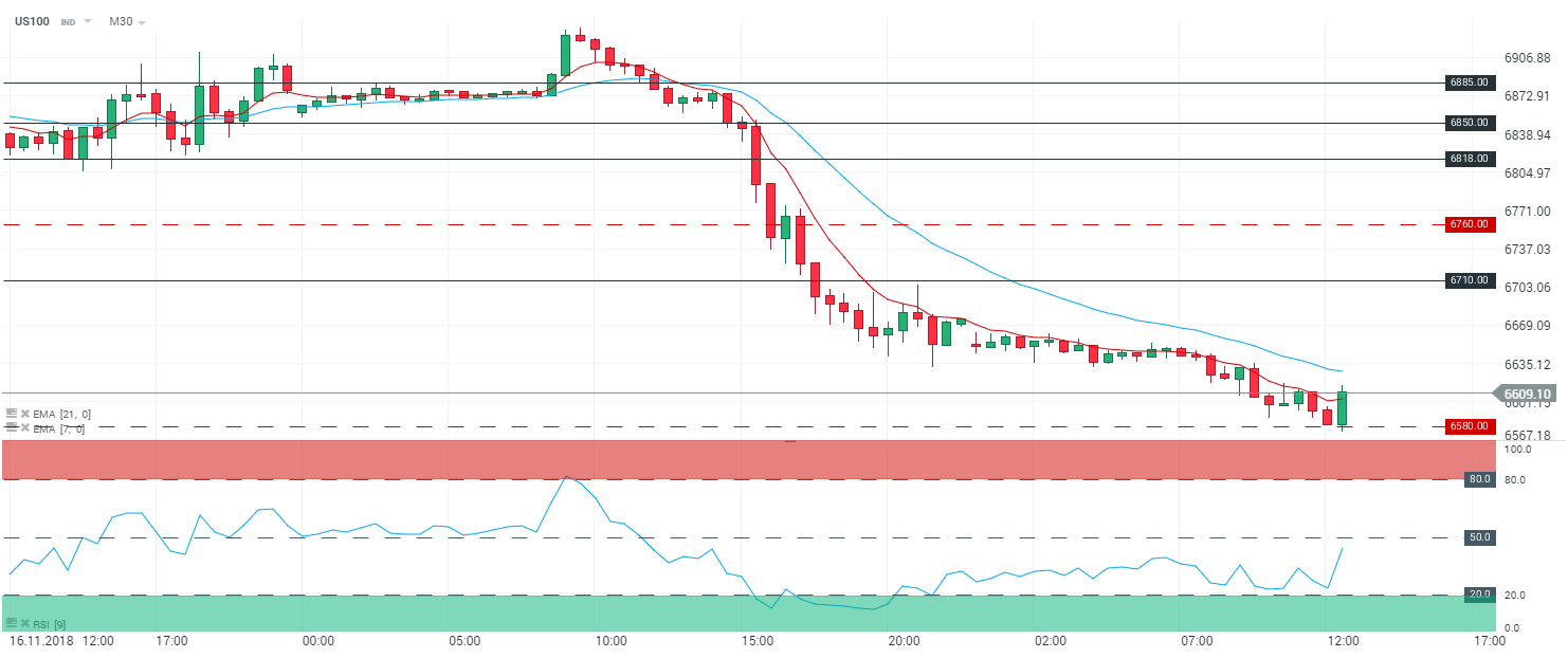 En 30 minutes (M30), l’indice Nasdaq (US100) évolue en tendance baissière. Les cours sont capés par sa moyenne mobile à 21 périodes, mais sont portés par la moyenne à 7 périodes. Le RSI est orienté à la hausse en direction de sa zone de neutralité et oscille à 44,2 points. Les cours semblent avoir rebondi sur leur support des 6 580 points - point le plus bas atteint le 29 octobre lorsque l’indice perdait plus de 350 points ! Dans ce contexte, nous serons haussiers en direction des 6 710 points et par extension le niveau des 6 760 points.