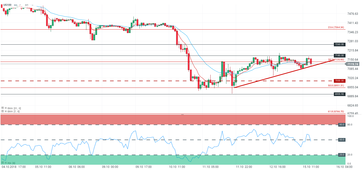 En unité de temps horaire (H1), l’indice est orienté à la baisse. Cependant nous notons que les cours ne parviennent pas à enfoncer le support oblique – ni à s’affranchir de la zone de résistance sur le niveau des 7 180 points – ensemble qui forme un triangle ascendant. Les prix évoluent sous leurs moyennes mobiles à 7 et 21 périodes. Le RSI est orienté à la baisse et oscille à 47,9 points.