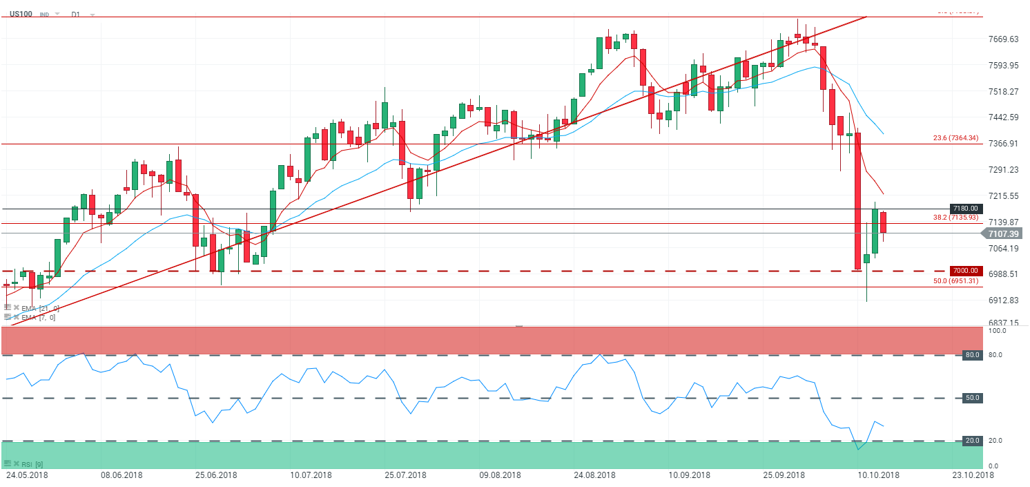 En unité de temps journalière (D1), le Nasdaq (US100) évolue en tendance baissière en deçà du niveau des 7 135 points – correspondant aux 38,2 % des retracements de Fibonnaci. Les cours sont capés par les moyennes mobiles à 7 et 21 périodes. Le RSI est orienté à la baisse en direction de sa zone de « sur vente » et oscille à 30,1 points.