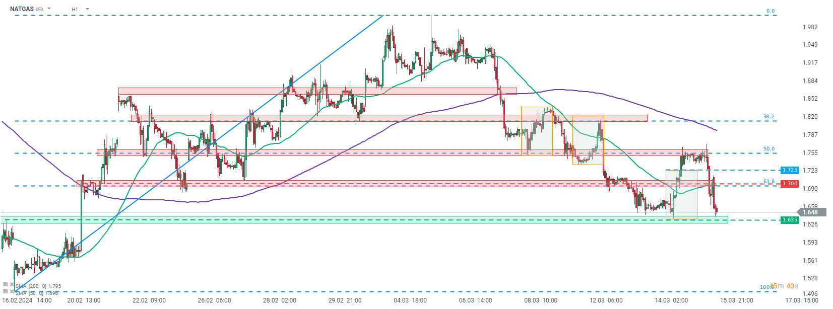 Si l'on examine le graphique de NATGAS à l'intervalle H1, on constate que le prix a dépassé la limite supérieure de la géométrie du marché local hier, ce qui laisse présager un possible renversement de la tendance à court terme. Cependant, l'avancée a ensuite été stoppée au niveau du retracement de 50% du mouvement haussier lancé le 19 février 2024. La vente a repris aujourd'hui, le prix effaçant tous les gains d'hier et testant la zone de support de 1,635 $. La première tentative de passer en dessous a échoué, mais les prix restent proches, et un autre test n'est pas à exclure.