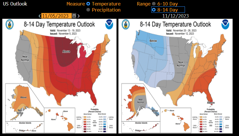 La hausse du NATGAS aujourd'hui est alimentée par de nouvelles prévisions météorologiques pour les États-Unis. Une nouvelle prévision sur 8-14 jours indique des températures inférieures à la moyenne dans la partie ouest des États-Unis et des températures supérieures à la moyenne dans la partie est du pays. Il s'agit d'un revirement majeur par rapport à il y a une semaine, lorsque les prévisions indiquaient des températures supérieures à la moyenne presque partout aux États-Unis dans un avenir proche. Une baisse des températures signifie que la demande de chauffage, et donc de gaz naturel est susceptible d'augmenter.