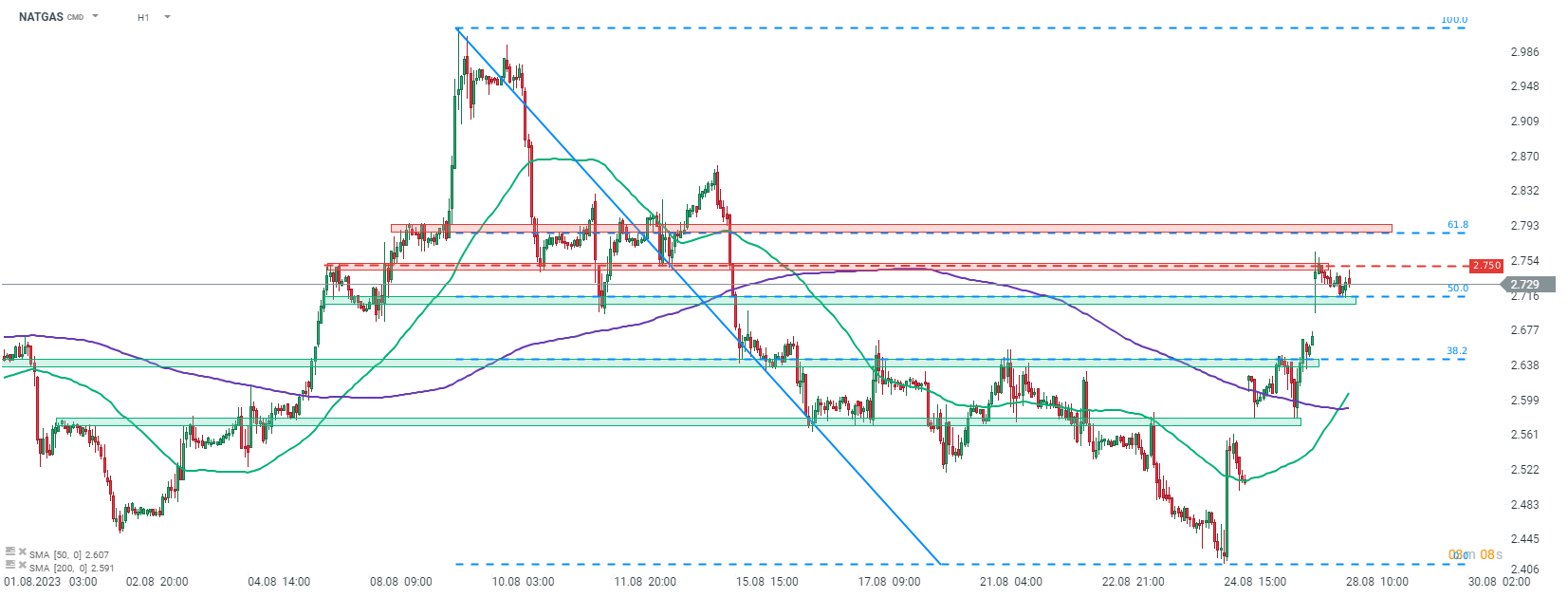 En examinant le graphique de NATGAS à l'intervalle H1, nous pouvons voir que le prix a entamé le trading d'aujourd'hui avec un écart de prix haussier et a continué à monter par la suite. Les gains ont été stoppés après avoir atteint la zone de swing de 2,75 $ et les baissiers ont commencé à prendre le dessus par la suite. Bien que NATGAS ait réduit une partie de ses gains, il a trouvé un soutien au retracement de 50% du mouvement à la baisse lancé au début du mois d'août.