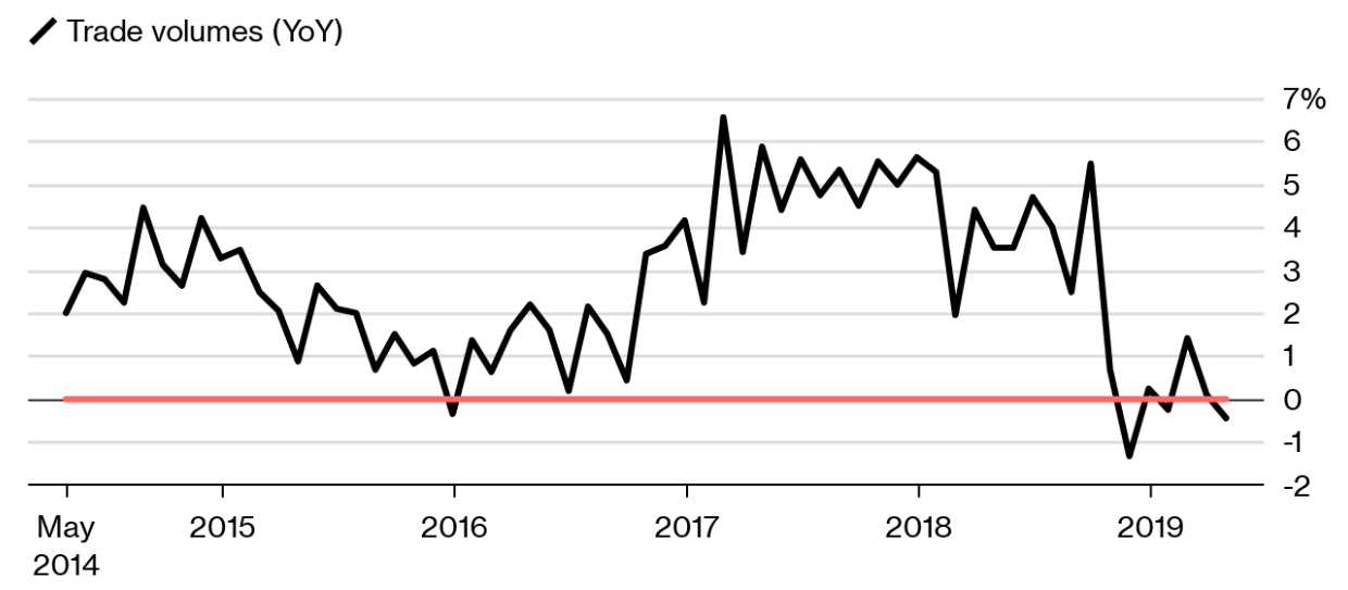 La croissance du commerce mondial sous pression avec la chute des volumes d'une année sur l’autre. Sources : Bureau for Economic Policy Analysis - Bloomberg