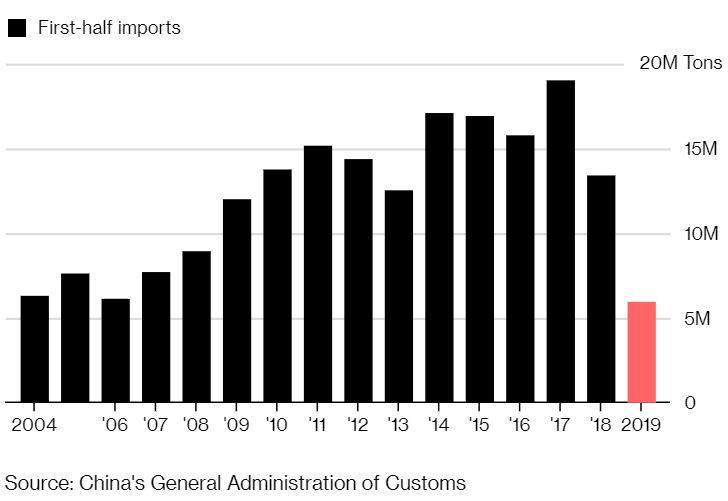 Au 30 juin 2019, la Chine a importé 5.9 millions de tonnes de soja américain - soit au plus bas depuis 2004. Sources : Administratio générale des douanes chinoises - Bloomberg