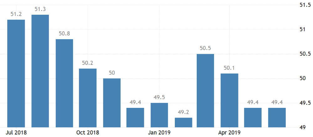 Le secteur manufacturier chinois en contraction depuis mai 2019. Sources: tradingeconomics - office national des statistiques de la Chine
