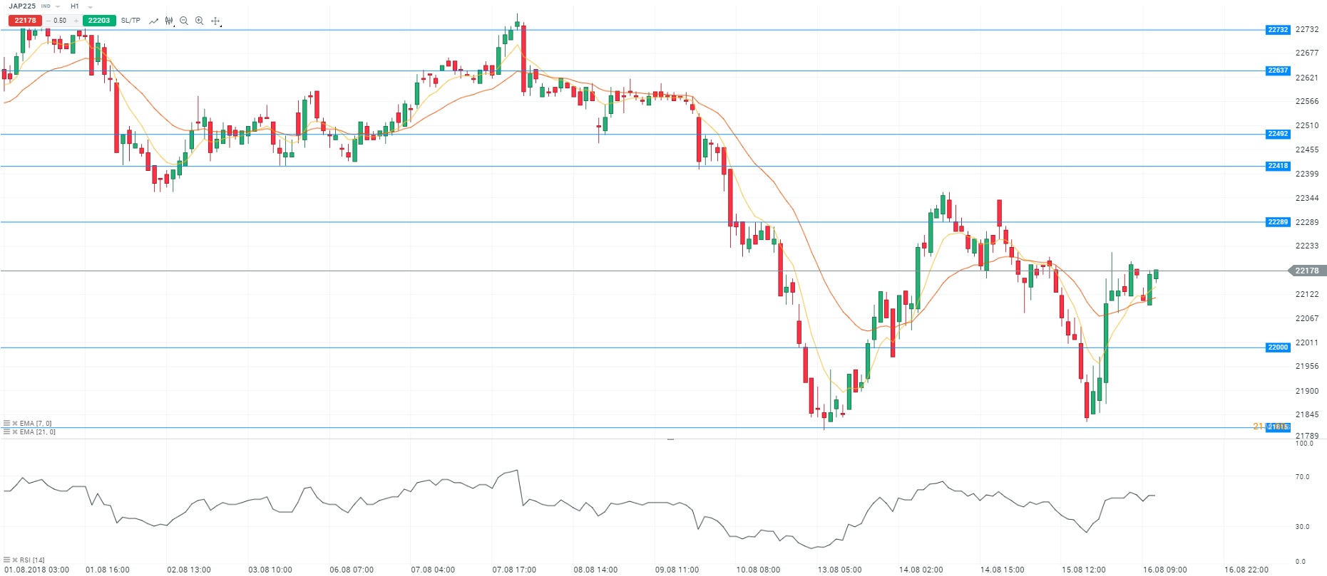 Le Bourse de Tokyo a clôturé en baisse de 0,05% au niveau des 22 192 points. Les inquiétudes persistent autour des marchés émergents. Sur le plan commercial, les exportations japonaises ont ralenti en juillet en raison des droits de douane américains sur les importations d’automobiles étrangères notamment japonaises. Dans le même temps, les importations en provenance des Etats-Unis ont progressé de 11%. Cette hausse concerne le pétrole brut, les moteurs et le gaz liquéfié. En outre, le ministère chinois du Commerce a annoncé que les négociations commerciales avec les Etats-Unis reprendront à la fin du mois. Cette annonce a permis aux indices asiatiques de limiter leur perte. D’un point de vue technique, les cours évoluent au-dessus des moyennes mobiles (à 7 et 21 périodes) en unité de temps horaire (H1). Le RSI est stable autour de sa zone de neutralité. En conclusion, nous avons un biais acheteur avec comme objectif le niveau des 22 289 points.