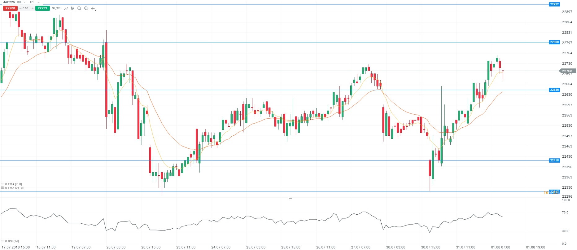 La Bourse de Tokyo a clôturé en hausse de 0,86% mardi au niveau des 22 746 points. Sur le marché des changes, la paire USDJPY a atteint le seuil des 112 yens pour un dollar ce matin. Cet affaiblissement du yen favorise les valeurs exportatrices. Du côté des entreprises, Sony a progressé de 4,75% suite à l’annonce d’un bénéfice trimestriel record. Dans le même temps, Nintendo a gagné 6,37% en raison d’une augmentation de 88% de son résultat opérationnel. Pour rappel, la Banque du Japon a laissé sa politique monétaire inchangée notamment son programme d’assouplissement quantitatif. Par ailleurs, l’institution a révisé ses prévisions sur l’inflation à la baisse et a annoncé que l’objectif de 2% ne sera pas atteint avant trois ans. Enfin, les indices asiatiques sont pénalisés par le regain des tensions commerciales et le plus fort ralentissement de la croissance du secteur manufacturier en huit mois en Chine. D’un point de vue technique, les cours évoluent au-dessus de la moyenne mobile courte (à 7 périodes) en unité de temps horaire (H1). Le RSI est stable proche de sa zone de surachat. En conclusion, nous avons un biais vendeur avec comme objectif le niveau des 22 646 points.