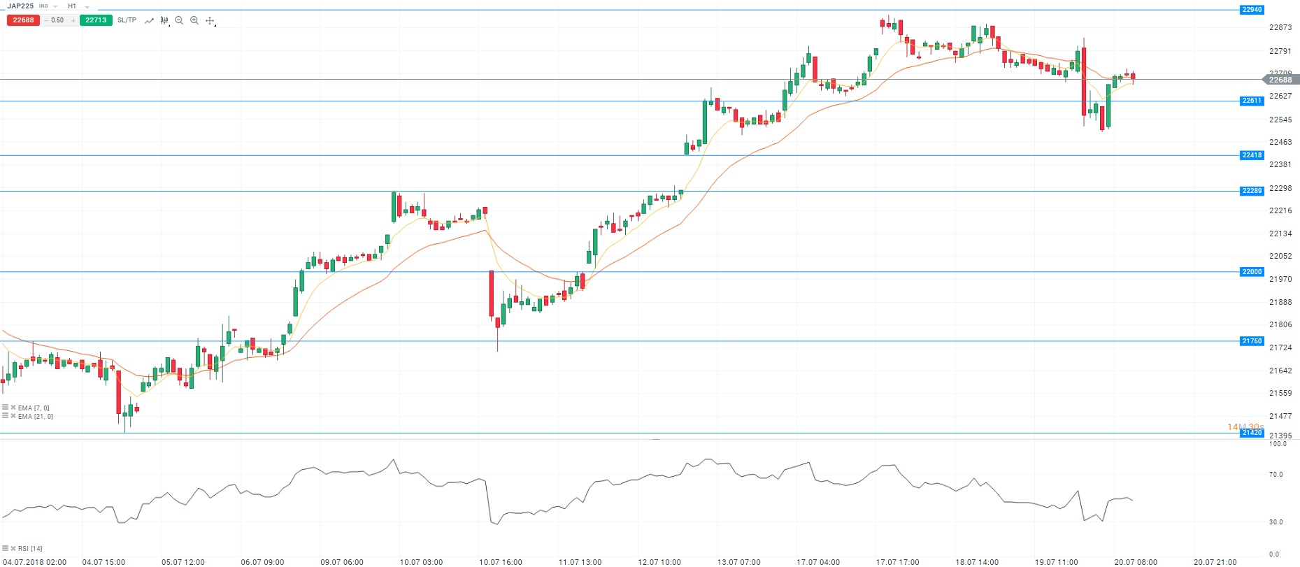 La Bourse de Tokyo a clôturé en baisse de 0,29% au niveau des 22 697 points. Les marchés asiatiques ont été freinés par le nouvel affaiblissement du yuan sur le marché des changes. La paire USDCNY s’inscrit sur un plus haut d’un an au niveau des 6,79 yuans pour un dollar. Par la suite, la devise chinoise a rebondi, permettant aux indices chinois de terminer en territoire positif. Sur le plan des statistiques économiques, nous avons pris connaissance de l’indice des prix à la consommation du mois de juin au Japon. L’inflation s’est établie à 0,1% en rythme mensuel. Cette hausse des prix est principalement due à la hausse des cours du pétrole. En conséquence, le consensus anticipe une révision à la baisse des prévisions d’inflation par la Banque du Japon. Pour rappel, la prochaine réunion de politique monétaire de l’institution est prévue à la fin du mois. D’un point de vue technique, les cours évoluent autour des moyennes mobiles (à 7 et 21 périodes) en unité de temps horaire (H1). Le RSI est stable autour de sa zone de neutralité. En conclusion, nous avons un biais vendeur avec comme objectif le niveau des 22 611 points.