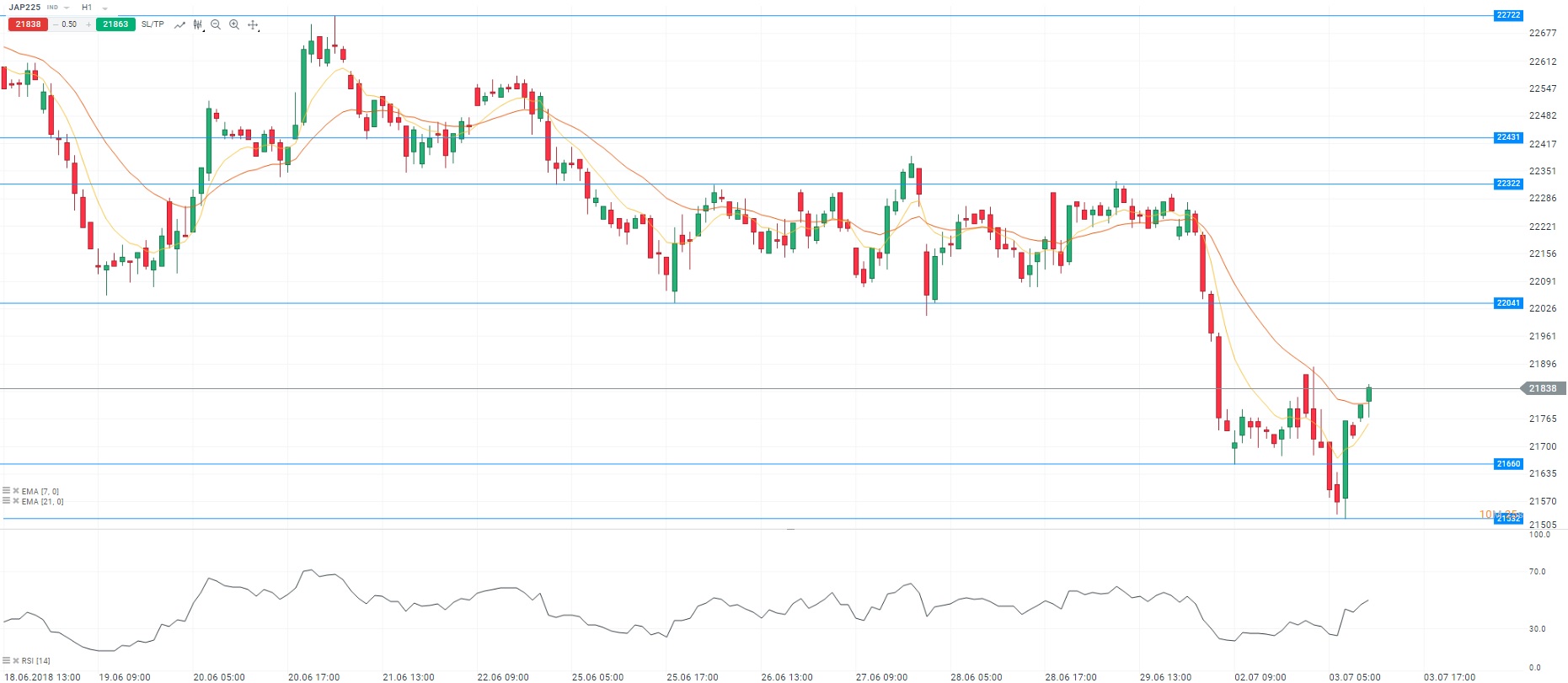 Le Bourse de Tokyo a clôturé en baisse de 0,12% au niveau des 21 785 points. En Asie, les indices restent pénalisés par la crainte des opérateurs sur le conflit commercial entre les Etats-Unis et la Chine. Cette situation risque de se prolonger jusqu’au 6 juillet, date de la mise en place des droits de douane sur les importations américaines de produits chinois. Par ailleurs, le gouverneur de la Banque populaire de Chine (BPC) a déclaré que l’affaiblissement du yuan est dû à la vigueur du dollar sur le marché des changes et aux « incertitudes extérieures ». Dans le même temps, on note un ralentissement des exportations chinoises vers les Etats-Unis au mois de juin. D’un point de vue technique, les cours évoluent au-dessus de la moyenne mobile courte (à 7 périodes) en unité de temps horaire (H1). Le RSI est orienté à la hausse autour de sa zone de neutralité. En conclusion, nous avons un biais acheteur avec comme objectif le niveau des 21 913 points.