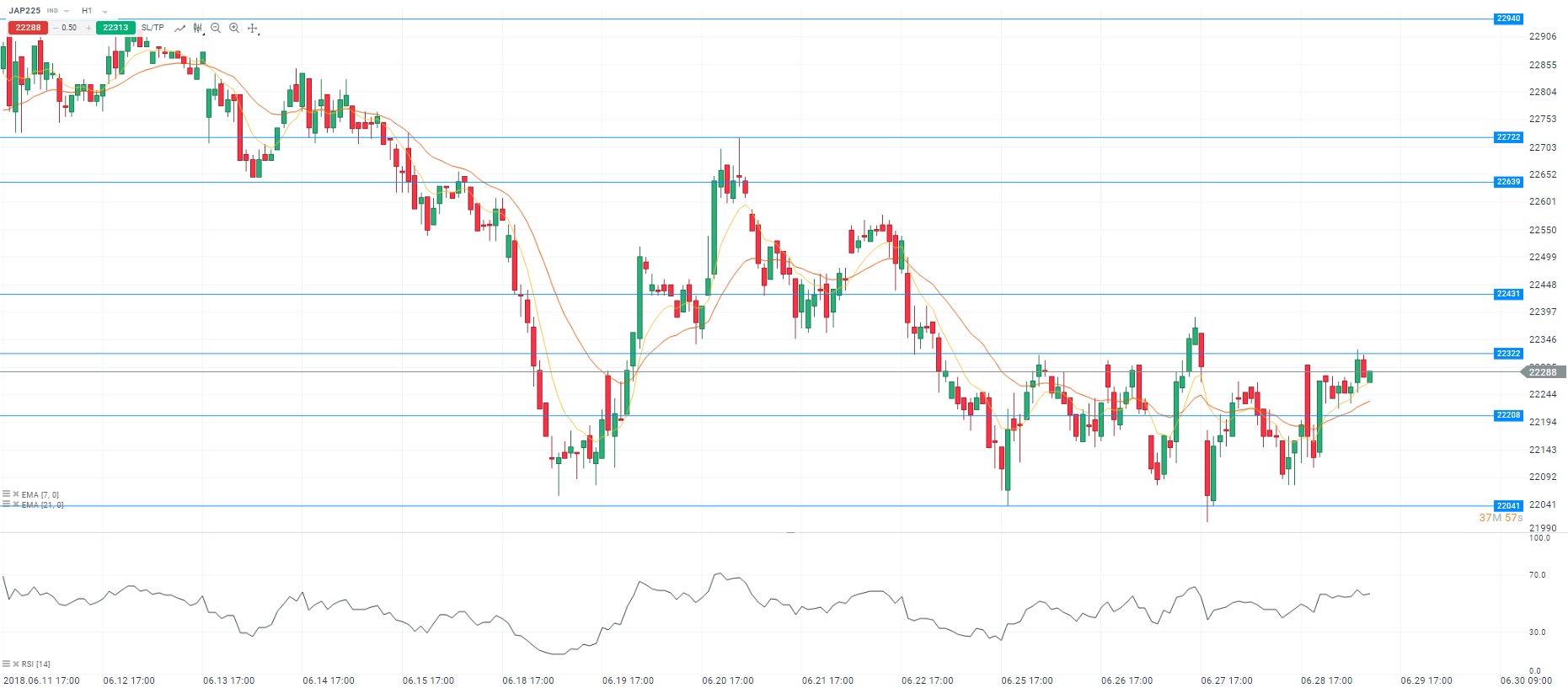 La Bourse de Tokyo a clôturé en légère hausse de 0,15% au niveau des 22 304 points. D’une manière générale, les indices asiatiques retrouvent des couleurs à l’image du Shanghai Composite qui a gagné 1,89%. Les tensions commerciales continuent de peser sur les valeurs technologiques telles que Screen Holdings et Shin-Etsu Chemical. Par ailleurs, Sharp a renoncé à son projet d’augmentation de capital et a terminé en hausse de 15,19%. Du côté des statistiques, nous faisons état d’une légère progression de l’inflation au mois de juin. Dans le même temps, la production industrielle a reculé moins que prévu en juin au Japon. Concernant le marché de l’emploi, le taux de chômage est au plus bas à 2,2%. Enfin, sur le marché des changes, le yen cède du terrain et la paire USDJPY évolue autour du niveau des 110,66 yens pour un dollar. D’un point de vue technique, les cours évoluent au-dessus de la moyenne mobile courte (à 7 périodes) en unité de temps horaire (H1). Le RSI est orienté en légère hausse autour de sa zone de neutralité. En conclusion, nous avons un biais acheteur avec comme objectif le niveau des 22 322 points.