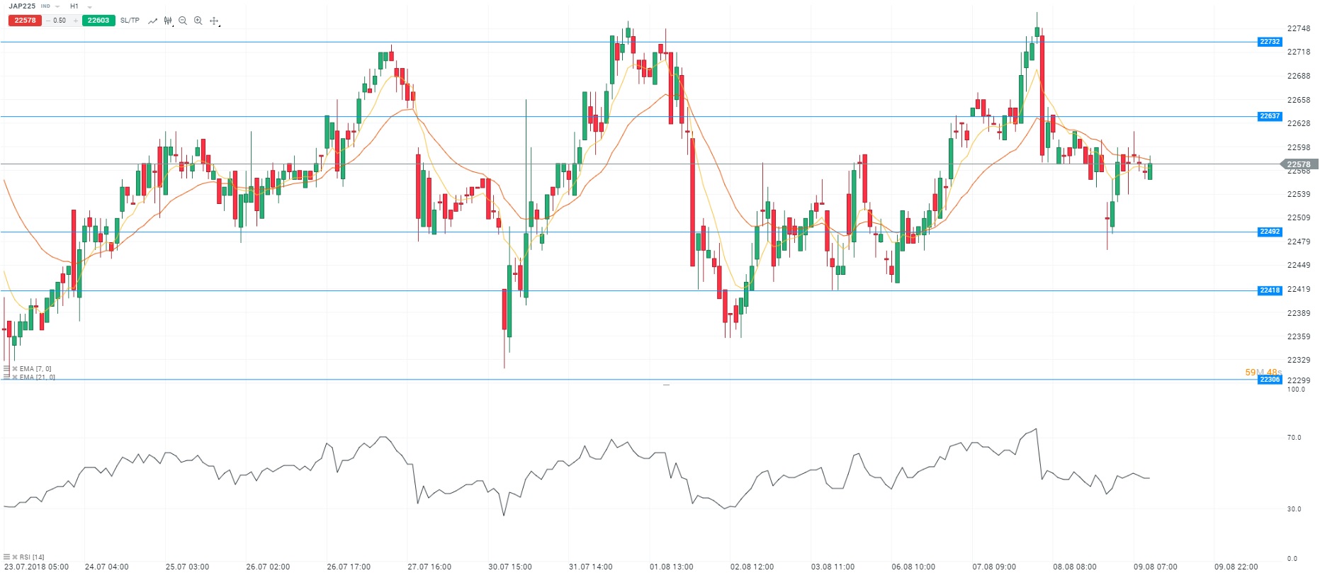 La Bourse de Tokyo a clôturé en baisse de 0,2% au niveau des 22 598 points. L’affaiblissement du yen sur le marché des changes a pesé sur la tendance. Cependant, on note un regain de la devise japonaise ce matin. En effet, la paire USDJPY est repassée au-dessus du seuil des 111 yens pour un dollar. Pour rappel, des négociations avec les Etats-Unis ont lieu ce jour à Washington sur le dossier commercial. Le secteur automobile japonais est pénalisé par la déclaration du ministère des Transports faisant état d’erreurs dans les procédures de test anti-pollution chez certains constructeurs. En Chine, on note une décélération des prix à la production en juillet même si les données publiées sont supérieures aux prévisions. Par ailleurs, l’indice des prix à la consommation est ressorti à 2,1% au mois de juillet, en rythme annuel. D’un point de vue technique, les cours évoluent autour des moyennes mobiles (à 7 et 21 périodes) en unité de temps horaire (H1). Le RSI est stable autour de sa zone de neutralité. En conclusion, nous avons un biais acheteur avec comme objectif le niveau des 22 637 points.