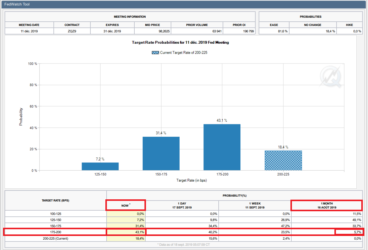A la lecture des données du CME FedWatch, nous pouvons voir que la probabilité d’une seule et unique baisse de taux de 25 pdb pour cette fin d'année ne cesse d’augmenter : il y a 1 mois seulement 5.7 % de probabilité pour une seule et unique réduction de taux ; Aujourd’hui cette probabilité atteint 43.5 %. Source : CME FedWatch.