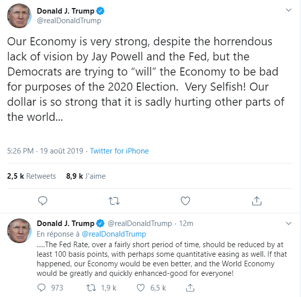 Selon la déclaration de Donald sur Twitter : « Notre économie est très forte, malgré l’horrible manque de vision de Jerome Powell et de la Fed, mais les démocrates essaient de ‘vouloir’ que l’économie soit mauvaise pour leurs objectifs électoraux de 2020. Très égoïste ! Notre dollar est si fort qu’il porte atteinte à d’autres régions du Monde. Les taux de la Fed, sur une période assez courte, devraient être réduits d'au moins 100 points de base, avec peut-être également un certain assouplissement quantitatif. Si cela se produisait, notre économie serait encore meilleure et l'économie mondiale se renforcerait grandement et rapidement, ce qui serait bénéfique pour tous! »