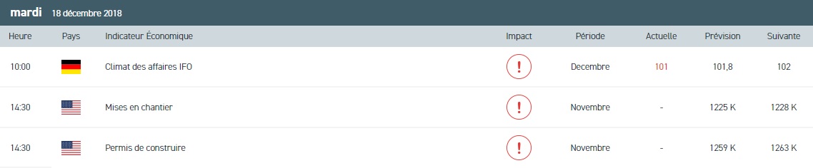 Après la forte baisse de lundi, les marchés européens fluctuent toujours en territoire négatif. Toutefois, les contrats à terme US progressent timidement. En Allemagne, l’indice Ifo du climat des affaires est ressorti inférieur aux attentes à 101 au mois de décembre, contre 102 le mois dernier. Concernant le calendrier économique de ce mardi, c’est le secteur de la construction américain qui focalisera l’attention des opérateurs avec la publication du nombre de permis de construire délivrés au titre du mois de novembre et les mises en chantier sur la même période. Enfin, l’American Petroleum Institute (API) fera état des premières estimations de stocks de pétrole pour la semaine achevée au 14 décembre. Décryptage.