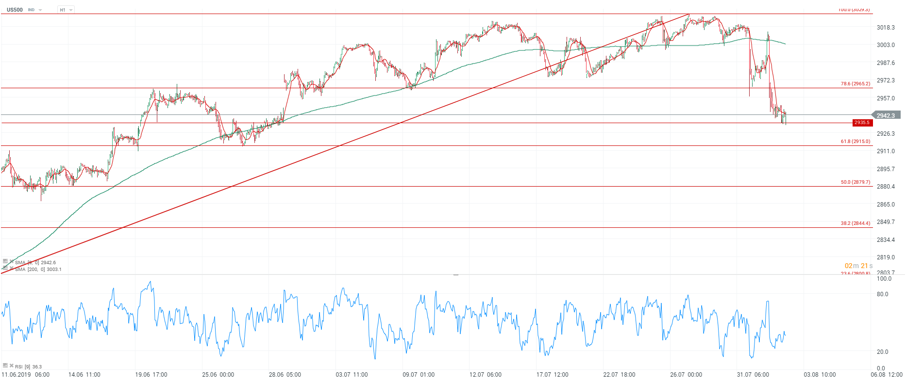 Les cours de l’indice S&P500 ont enfoncé leur support sur la zone de 2965 points correspondant aux 78.6 % des retracements de Fibonacci. La chute des cours a été stoppée par le support intermédiaire autour des 2935.5 points. Le RSI est orienté à la baisse et fluctue à 36.3 points. Source : xStation5.