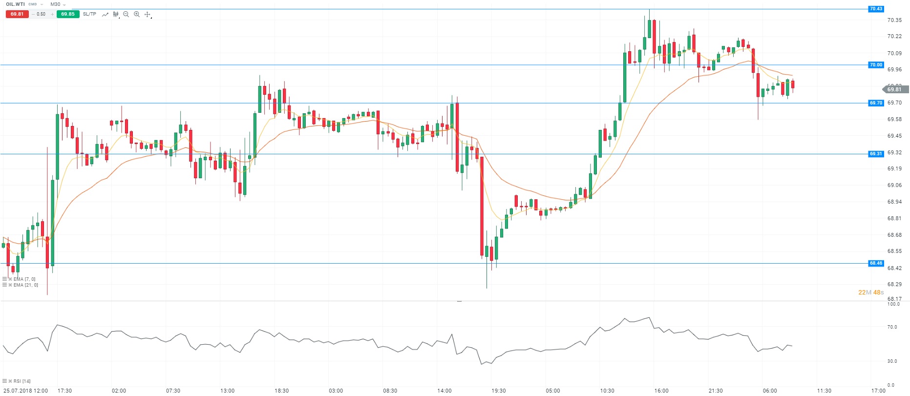 Sur le plan des matières premières, le contrat WTI a fini en hausse de 2,10% lundi au niveau des 70,13 dollars le baril. Les prix sont soutenus par un mouvement social en mer du Nord et de la suspension des livraisons de pétrole par l’Arabie Saoudite au niveau de la mer Rouge par mesure de sécurité. De plus, le contexte reste marqué par les sanctions contre l’Iran. Enfin, une étude de Reuters faisant état d’une augmentation des extractions de la part de l’OPEP en juillet n’a pas freiné la tendance. D’un point de vue technique, les prix évoluent sous les moyennes mobiles (à 7 et 21 périodes) en unité de temps M30. Le RSI est stable autour de sa zone de neutralité. En conclusion, nous avons un biais neutre sur l’actif.