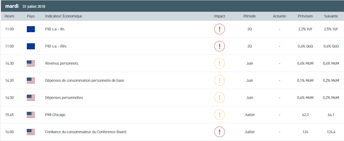 Wall Street a clôturé en baisse lundi dans le sillage des valeurs technologiques. En effet, le Nasdaq a reculé de plus de 1% pour la troisième séance consécutive. Des inquiétudes sont apparues sur les perspectives de croissance du secteur technologique après les résultats décevants de Facebook, Intel et Twitter. Les FAANG ont tous publié leurs résultats trimestriels mis à part Apple dont les résultats sont attendus ce soir après la clôture. Seuls les secteurs des télécoms et de l’énergie ont performé. En Europe, la tendance a été similaire. La prudence étant de mise avant plusieurs réunions de politiques monétaires. Sans surprise, les valeurs technologiques ont souffert dans le sillage de leurs homologues américains. Du côté asiatique, le Nikkei 225 a terminé en légère hausse de 0,04% au niveau des 22 553 points en raison de la faiblesse du yen après l’intervention de la Banque du Japon. Enfin, l’indice PMI manufacturier recule en Chine pour le troisième mois consécutif au mois de juillet.