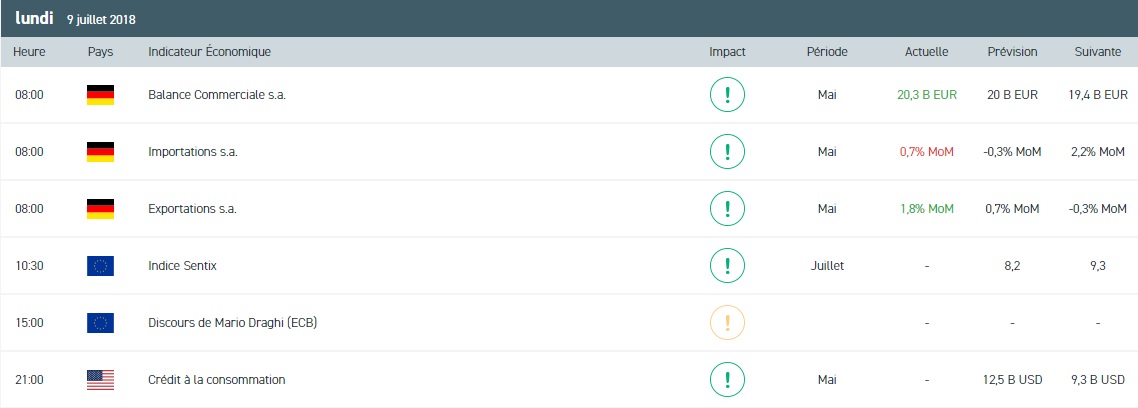 Comme évoqué en introduction, cette semaine sera dominée par le début de la saison des résultats aux Etats-Unis. Bien que le consensus anticipe une hausse des bénéfices de 20,7 % au deuxième trimestre, les investisseurs tablent sur une dégradation des perspectives pour le deuxième semestre et une contraction des investissements. Et pour cause, la guerre commerciale est désormais effective entre les Etats-Unis et la Chine. C’est pourquoi la communauté des investisseurs fait preuve de scepticisme à l’égard de cette saison des résultats. Du côté du Royaume-Uni, David Davis, ministre en charge du Brexit, a présenté sa démission à la Première ministre Theresa May. Evidemment, cette démission à un impact significatif sur la livre sterling. Au moment où nous écrivons ces lignes, la paire GBPUSD accuse un repli de 30 pips à 1,3294 $ pour 1 £.