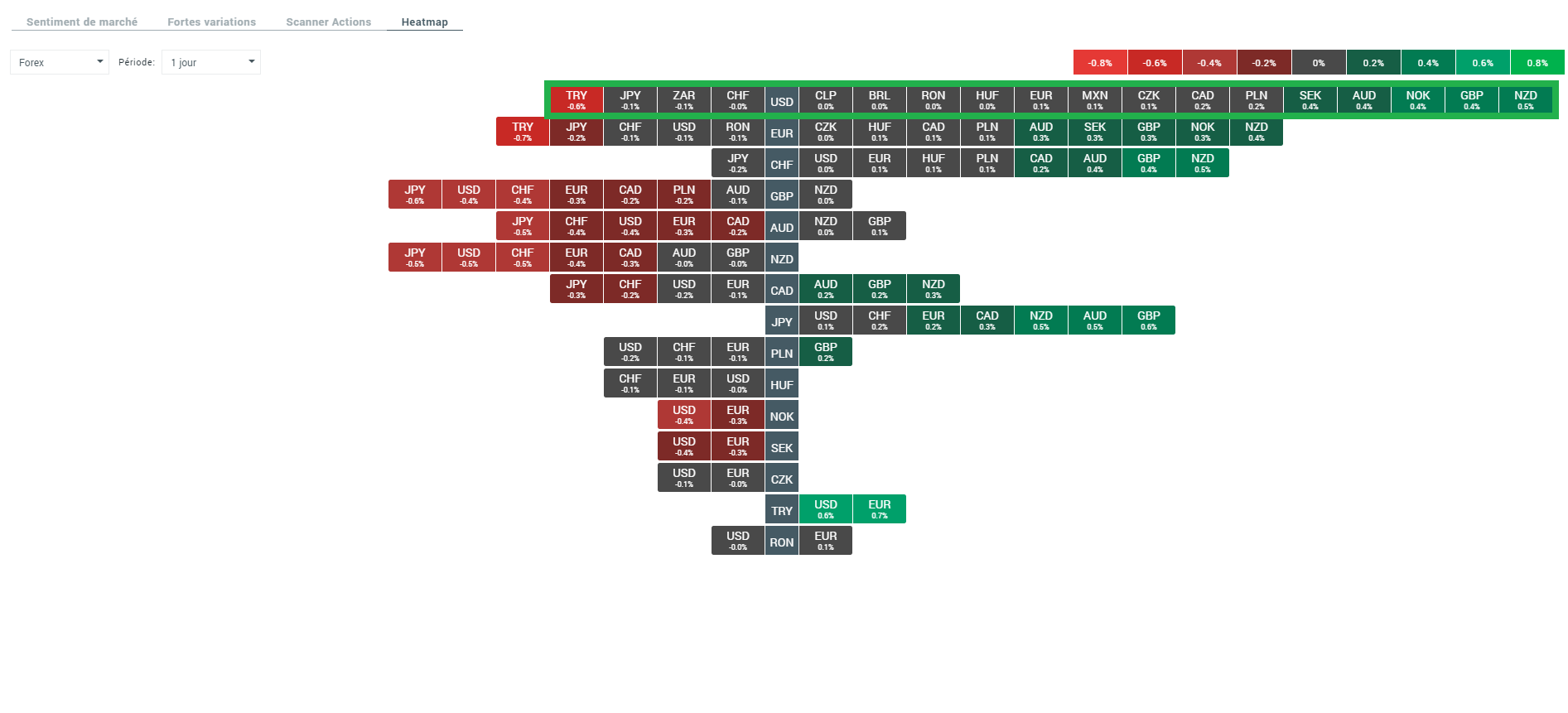 Heatmap des paires de devises majeures. L’USD se replie face à l’ensemble des paires majeures à l’image de l’euro, du dollar australien, du dollar canadien, et de la couronne norvégienne. Source : xStation5.