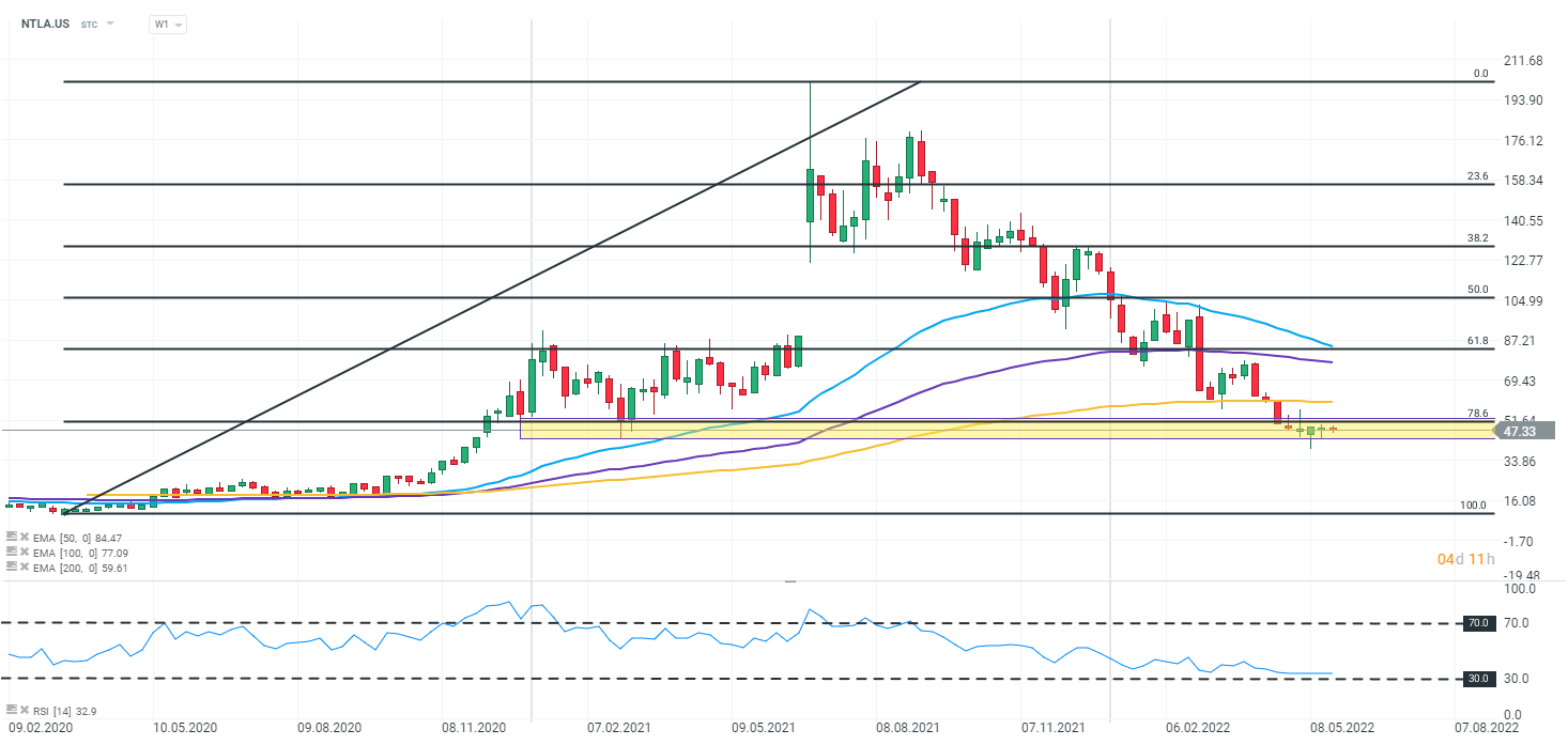 Graphique du cours de l'action Intellia Therapeutics (NTLA.US), intervalle W1. Les quatre dernières semaines ont apporté un ralentissement dans la dynamique des changements de la valeur de l'action de la société. En ce moment, la structure de support est testée, qui est définie par les creux de décembre 2020 et de février et mars 2021. La zone du retracement à 78,6 % de la vague ascendante suivant le creux du krach Covid et la moyenne mobile exponentielle à 200 périodes (ligne dorée) peuvent servir de niveaux de résistance de court terme. Le support fondamental est maintenant le creux du 12 mai 2022 (autour de 40 $ par action). Source : xStation5