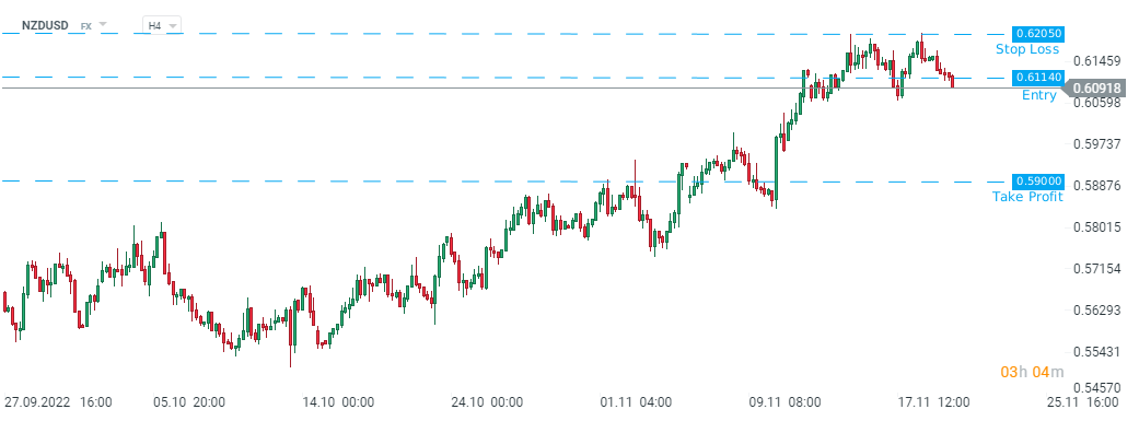 Le Crédit Agricole recommande de prendre une position à la vente sur le NZDUSD à 0,6114 avec un objectif de 0,5900 et un ordre stop loss placé à 0,6205. Source : xStation5