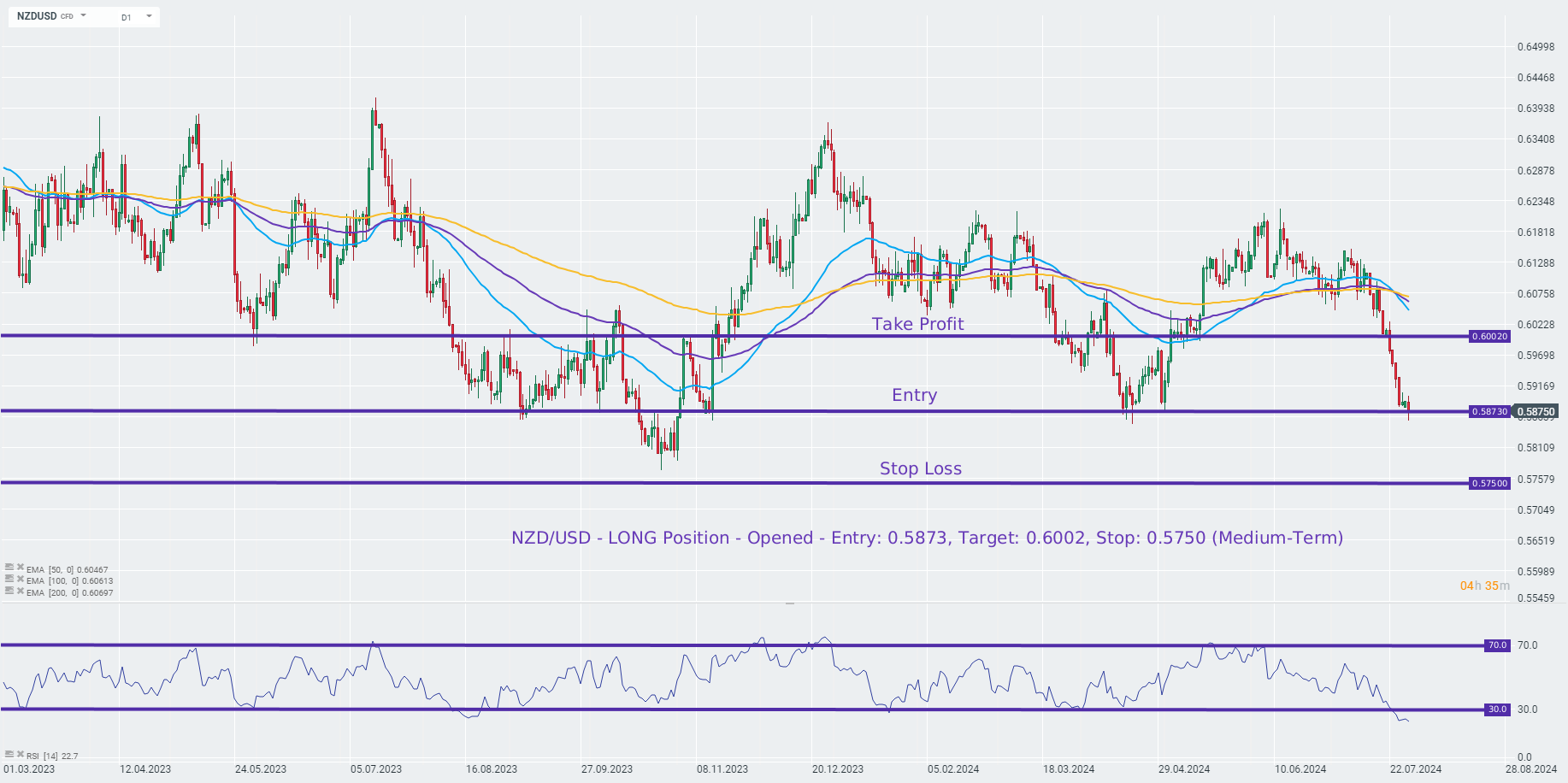 Le Crédit Agricole recommande de prendre une position acheteuse sur NZDUSD au cours du marché avec un objectif de 0,6002 et un ordre stop loss à 0,5750. Source : xStation5