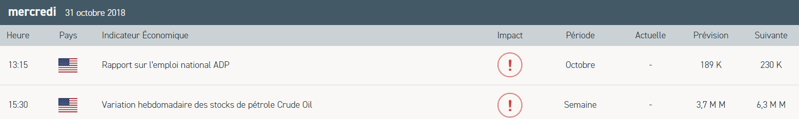 - Le rapport de l’enquête ADP sur la création d’emploi dans le secteur privé aux Etats-Unis à 13h15 pour le mois d’octobre