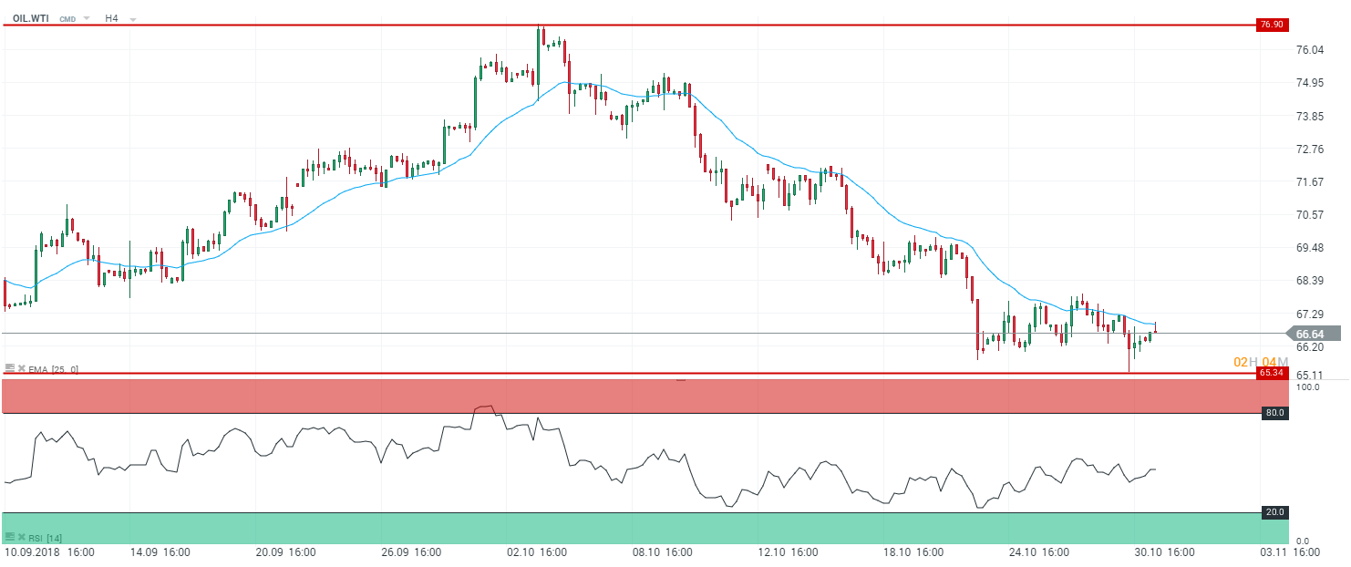 Les premières estimations de l’American Petroleum Institute (API) font état d’une augmentation des stocks hebdomadaire de pétrole de 5,7 millions de barils de pétrole pour la semaine terminée au vendredi 26 octobre. Il faudra cependant attendre la publication du département de l’Energie (DoE) à 15h30 afin de confirmer l’augmentation des stocks en ce début de période hivernale. Nous notons que la Russie a fait état d’une augmentation de sa production de pétrole à 11,41 millions de barils par jour - s’inscrivant ainsi dans la volonté des pays producteur de pétrole d’augmenter l’offre mondiale. Pour rappel, les sanctions américaines concernant l’Iran entrent en pleine application ce dimanche 4 novembre. Dans ce contexte, les prix du WTI poursuivent leur repli et ont atteint le niveau des 65,34 $ le baril de pétrole.