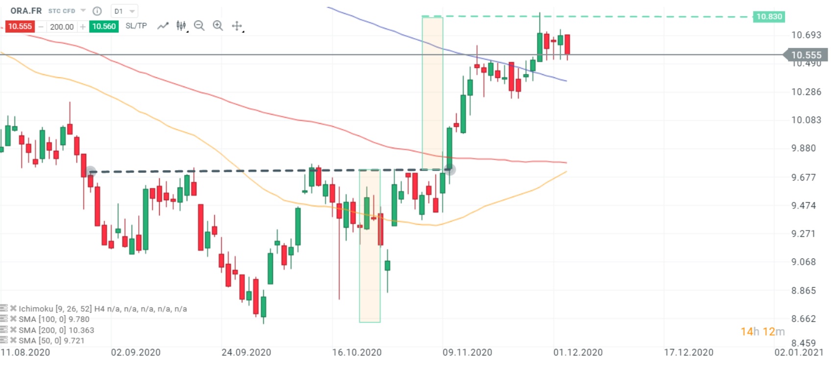 Les cours d’Orange (ORA.FR) ont ouvert légèrement en baisse en ce début de session. Après avoir réalisé l’objectif théorique de la figure en ETE inversée initiée en septembre, les cours évoluent dans l’enceinte d’un range ayant pour borne inférieure 10,510 euros, testée en début de séance. Le sens de sortie de ce range permettra de définir la tendance à venir Source : xStation5