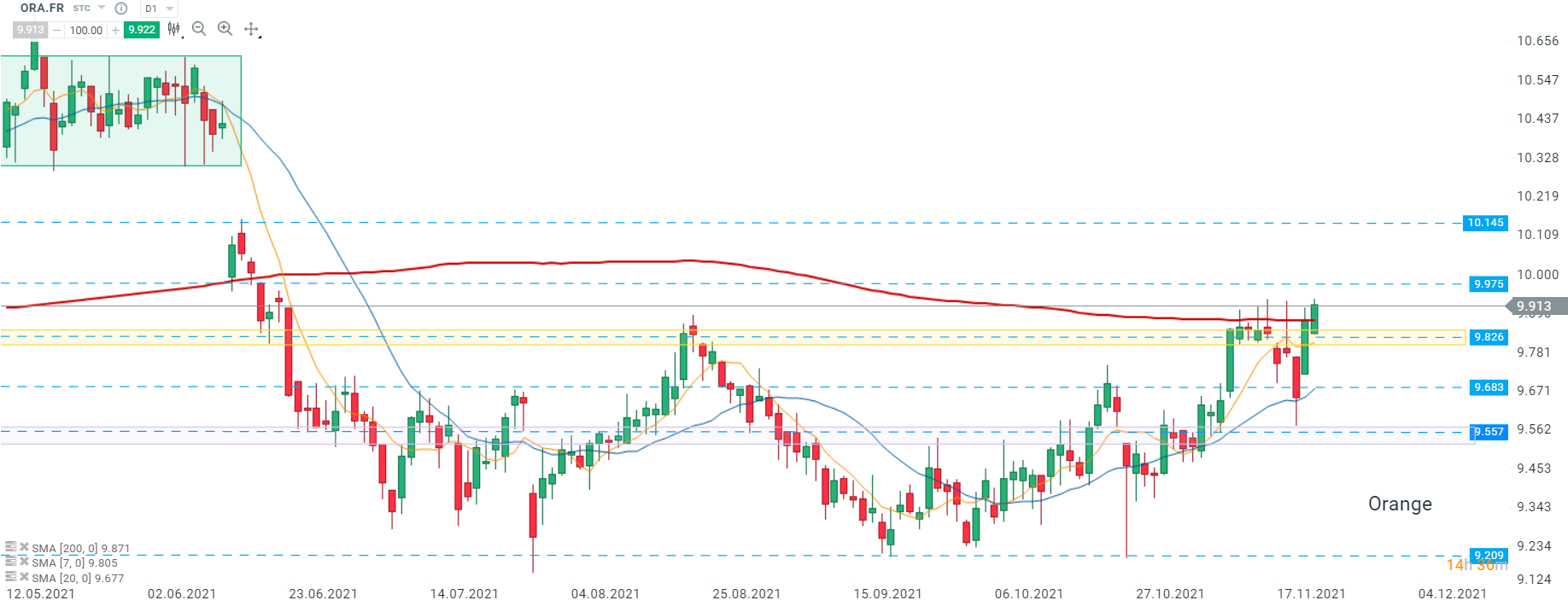 Les cours d’Orange (ORA.FR) ont entamé la séance d’aujourd’hui à la hausse, la nouvelle de l’acquisition ayant favorisé le sentiment à l’égard de la société de télécommunications. Prenant appui sur la zone de support à 9,826, les cours se dirigent vers la résistance à 9,975, dernier rempart avant la prochaine zone de résistance à 10,145. Toutefois, si les vendeurs prennent le contrôle, un retour au support à 9,683 serait à envisager. Source : xStation5