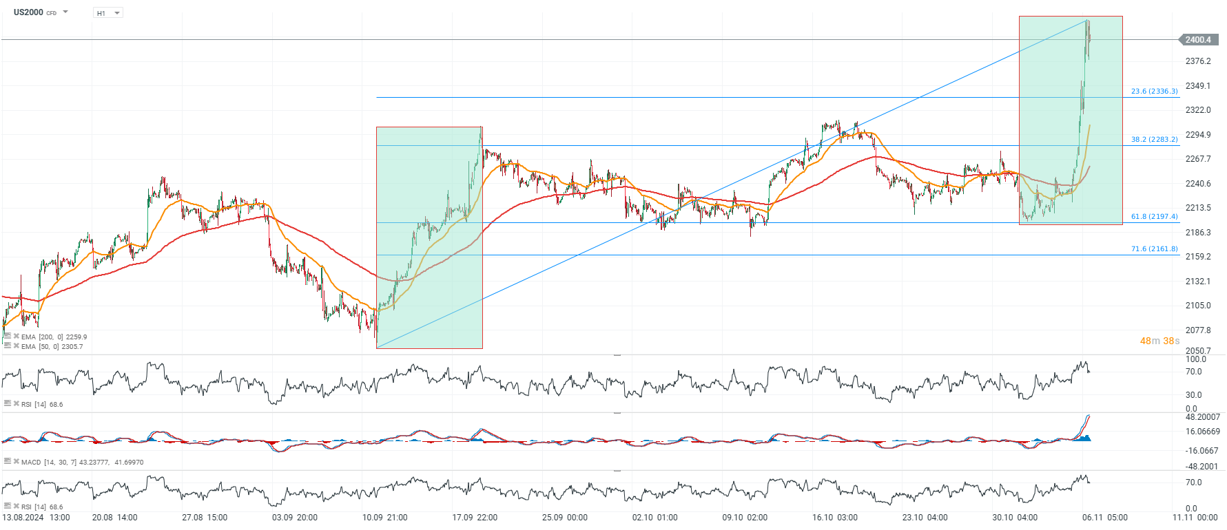 Les actifs américains progressent après la victoire de Trump, tandis que la vigueur du dollar américain ne gêne pas les indices, tandis que l'EURUSD perd près de 2 %. Les investisseurs apprécient la perspective de politiques protectionnistes et de réductions d'impôts, ainsi qu'une série de mesures prises par les Républicains et Trump, qui devraient s'attacher à créer des conditions d'exploitation optimales pour les entreprises américaines.