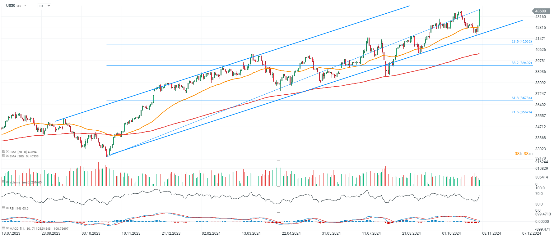 Les contrats à terme sur l'indice Dow Jones Industrial Average (US30) ont atteint de nouveaux records historiques aujourd'hui, dépassant les 43 800 points. Les investisseurs s'attendent à ce que les entreprises américaines de l'« économie traditionnelle » bénéficient largement des changements proposés par Donald Trump.