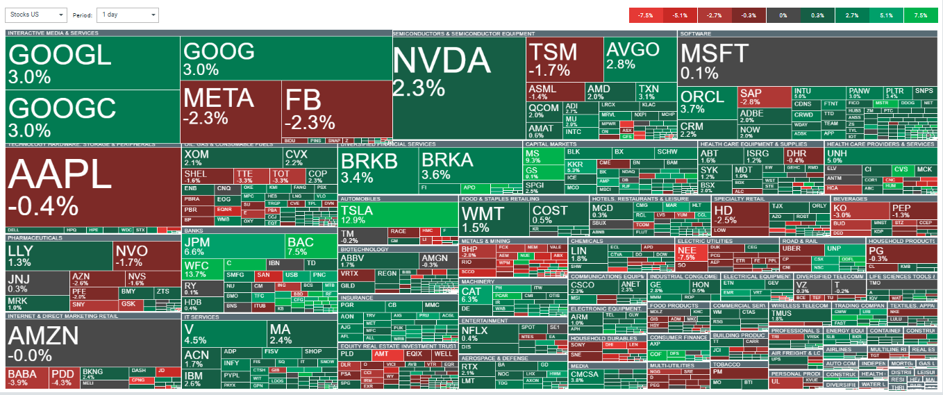 - Très fortes hausses dans le secteur bancaire et financier. Goldman Sachs et Morgan Stanley gagnent près de 7 % ; Wells Fargo augmente de près de 14 %.