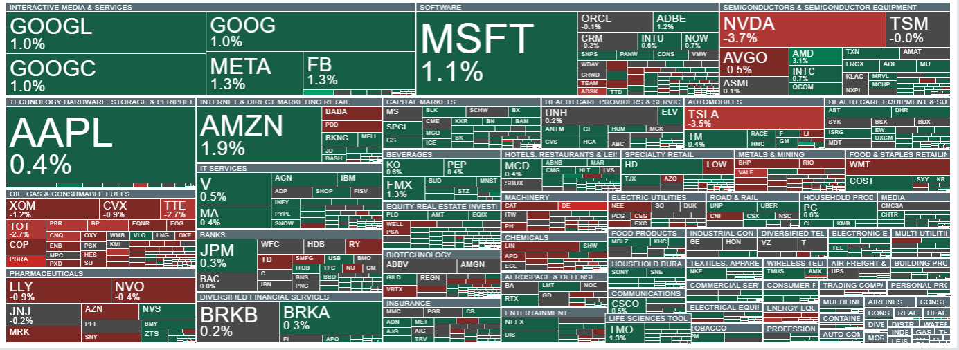 Changement en pourcentage des actions de l'indice S&P 500. Le sentiment le plus faible est observé parmi les sociétés pétrolières et gazières, les actions du secteur minier et les sociétés pharmaceutiques. Source : xStation5