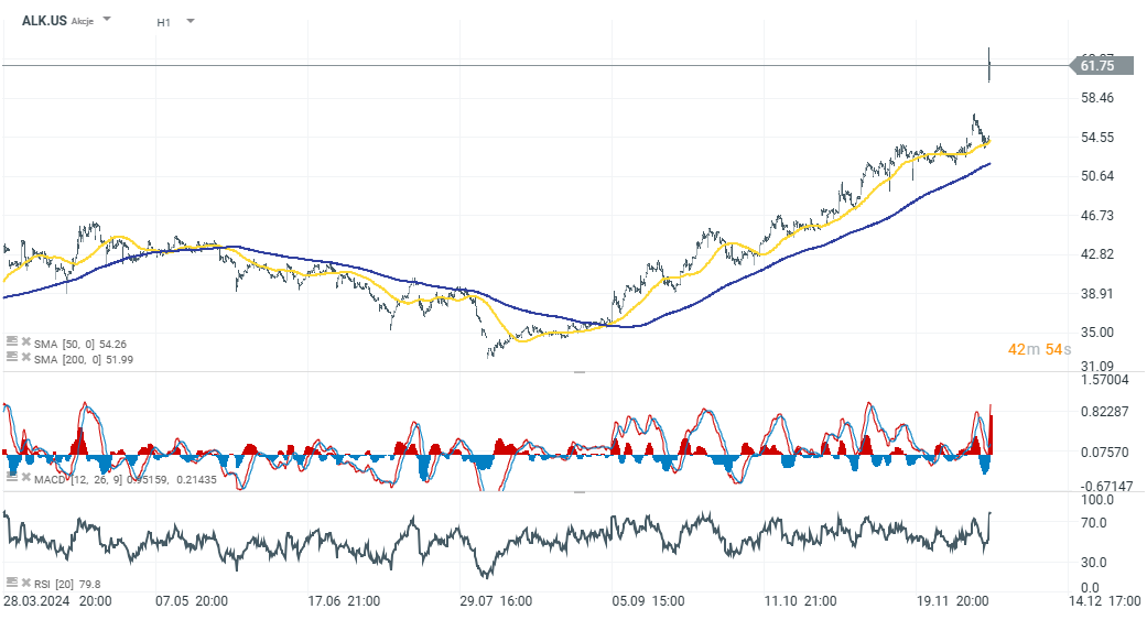 Alaska Air Group (ALK.US) a bondi de 13 % après avoir relevé ses prévisions de bénéfices pour le quatrième trimestre à 0,40-0,50 $ par action, contre 0,20-0,40 $. L'augmentation des réservations et du chiffre d'affaires en novembre a renforcé la confiance. La société prévoit une croissance des bénéfices de 1 milliard de dollars d'ici 2027, visant des marges avant impôts de 11 % à 13 % et un BPA supérieur à 10 $.