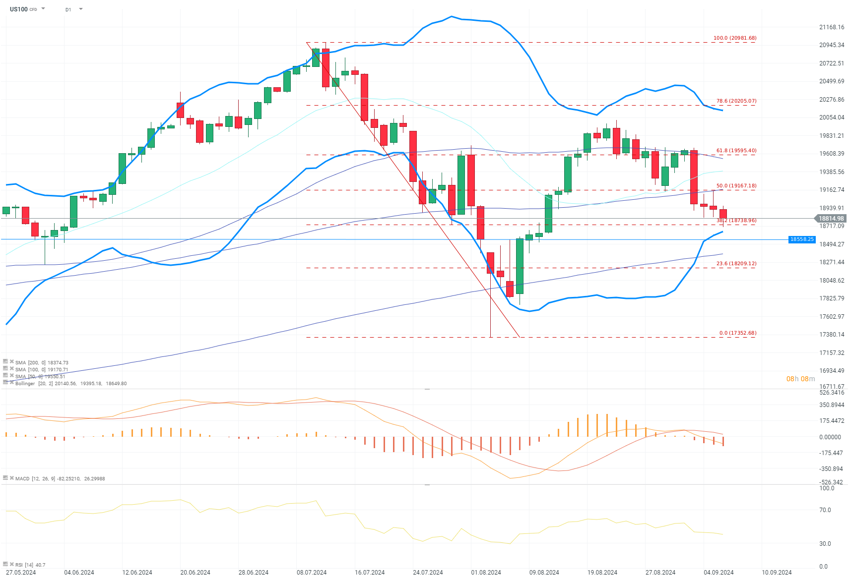 Le Nasdaq-100, représenté par le contrat US100, enregistre une baisse pour le quatrième jour consécutif. Un niveau de support clé se situe au retracement de Fibonacci de 38,2 % à 18 738 points, proche de la bande inférieure de Bollinger. Si ce seuil est franchi, le prochain support se situera à la moyenne mobile simple (SMA) 200 à 18 376 points, et au retracement de Fibonacci de 23,6 %. Pour que les haussiers reprennent la main, la résistance au niveau du retracement de Fibonacci de 50 % et de la SMA 100, autour de 19 167 points, devra être franchie, ce qui correspondrait également au plus haut d'hier, offrant un bon point de départ. Le RSI tend progressivement à la baisse, et le MACD indique une tendance baissière. Source : xStation 5