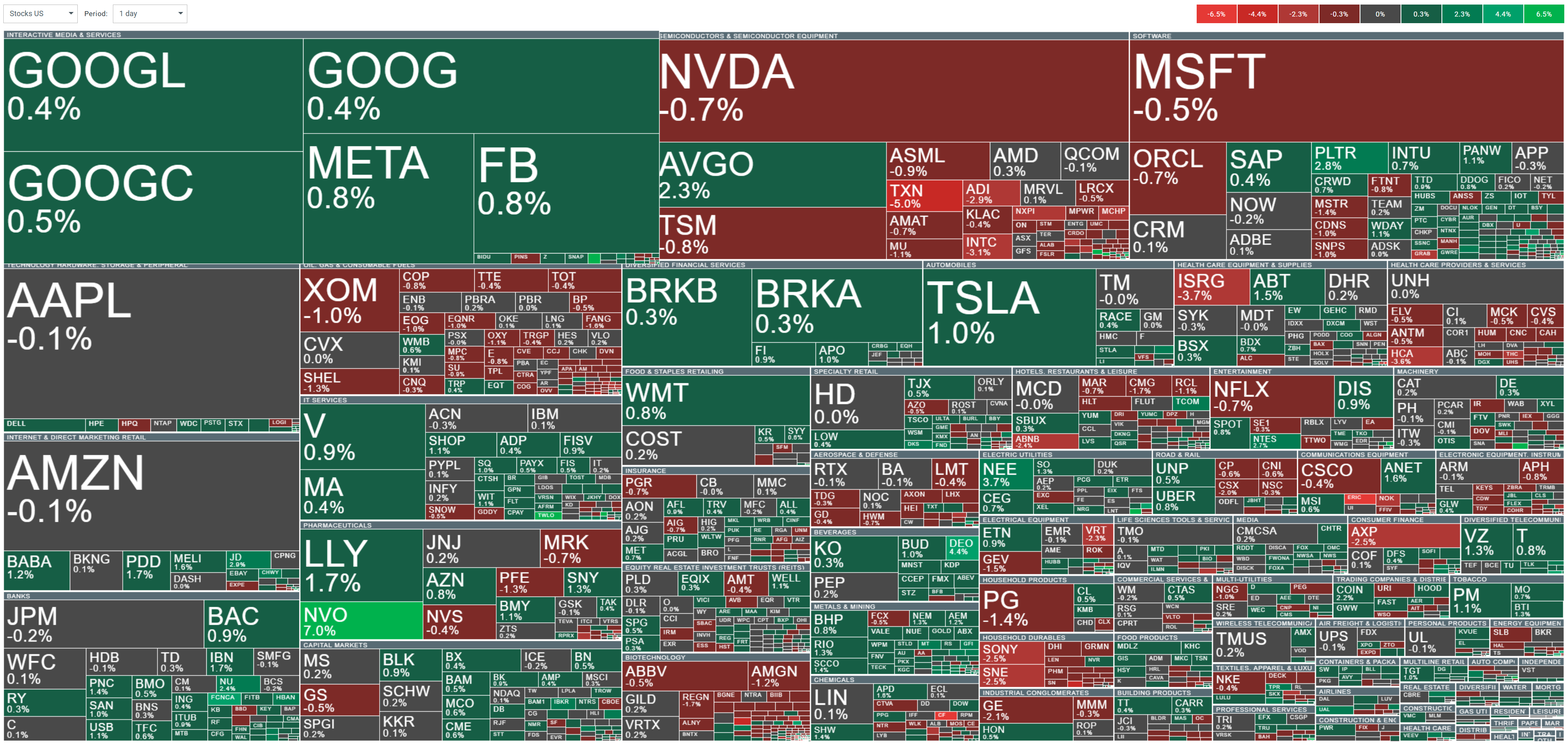 Les secteurs du S&P 500 affichent des performances mitigées: Le marché affiche des performances sectorielles variées, les services publics étant en tête des gains (+0,65 %), suivis par les services de communication (+0,57 %) et les biens de consommation de base (+0,16 %). L'énergie accuse la plus forte baisse (-0,65 %), tandis que les soins de santé (-0,25 %) et les produits industriels (-0,20 %) sont également sous pression. Les technologies de l'information sont en léger recul (-0,01 %), tandis que les valeurs financières progressent légèrement (+0,07 %). L'ensemble du S&P 500 reste stable avec un gain modeste de 0,02 %.