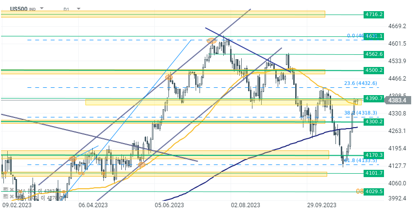 L'indice US500 perd légèrement à l'ouverture de la séance en cash à Wall Street. Néanmoins, l'indice consolide ses sommets après les gains récents. Si l'on examine le graphique du point de vue technique, les hausses se sont ralenties dans la zone de résistance entre 4370 et 4400 points. Ces niveaux ont été un obstacle efficace pour les baissiers au cours de la seconde moitié de juin et d'août de cette année. Il est possible que nous connaissions une légère correction à partir de ces niveaux. Cependant, si les haussiers parviennent à franchir ce niveau, la prochaine plage pour le mouvement à la hausse pourrait être de 4430 points, étant le prochain retracement de Fibonacci, puis 4500 points.
