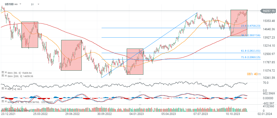 L'US100 reste proche des sommets de cette année mais la dynamique des impulsions haussières précédentes suggère qu'un scénario possible reste une correction des niveaux actuels et un nouveau test des 14 800 points où nous voyons le retracement de 23,6 Fibonacci de la vague haussière de septembre de cette année. Source: xStation 5