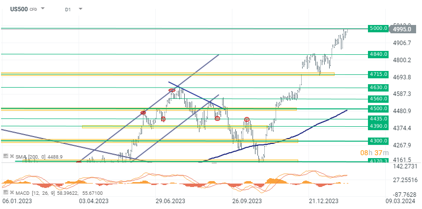 L'US500 s'approche du niveau historique de 5000 points. Aujourd'hui, l'indice US500 gagne 0,35% pour atteindre 4990 points au moment de la publication. Quatre séances plus tôt, nous avons déjà observé le premier test du niveau des 500 points. Si le sentiment d'aujourd'hui ne se détériore pas, nous pourrions assister à un autre test. Source: xStation 5