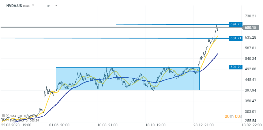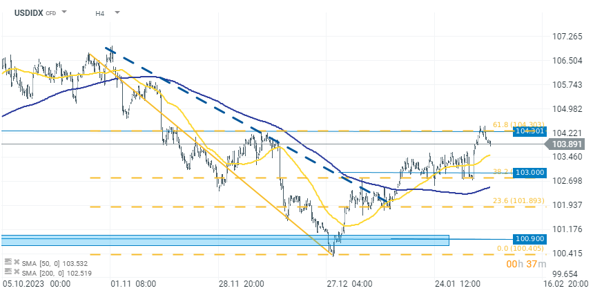 Le milieu de la semaine apporte de nouveaux gains sur le marché boursier américain. Les contrats à terme progressent en début de séance, l'indice US500 s'approchant de la barrière historique des 5 000 points. La hausse des actions est, bien entendu, soutenue par la saison des bénéfices. Nous avons déjà dépassé les publications les plus importantes et il est clair que les entreprises n'ont pas déçu les investisseurs. À quelques exceptions près, les rapports financiers sont solides, tout comme les perspectives pour 2024. Le meilleur sentiment est également entretenu par le retour à la baisse du dollar. Néanmoins, les rendements des bons du Trésor à 10 ans se redressent légèrement et reviennent autour de 4,10 %.