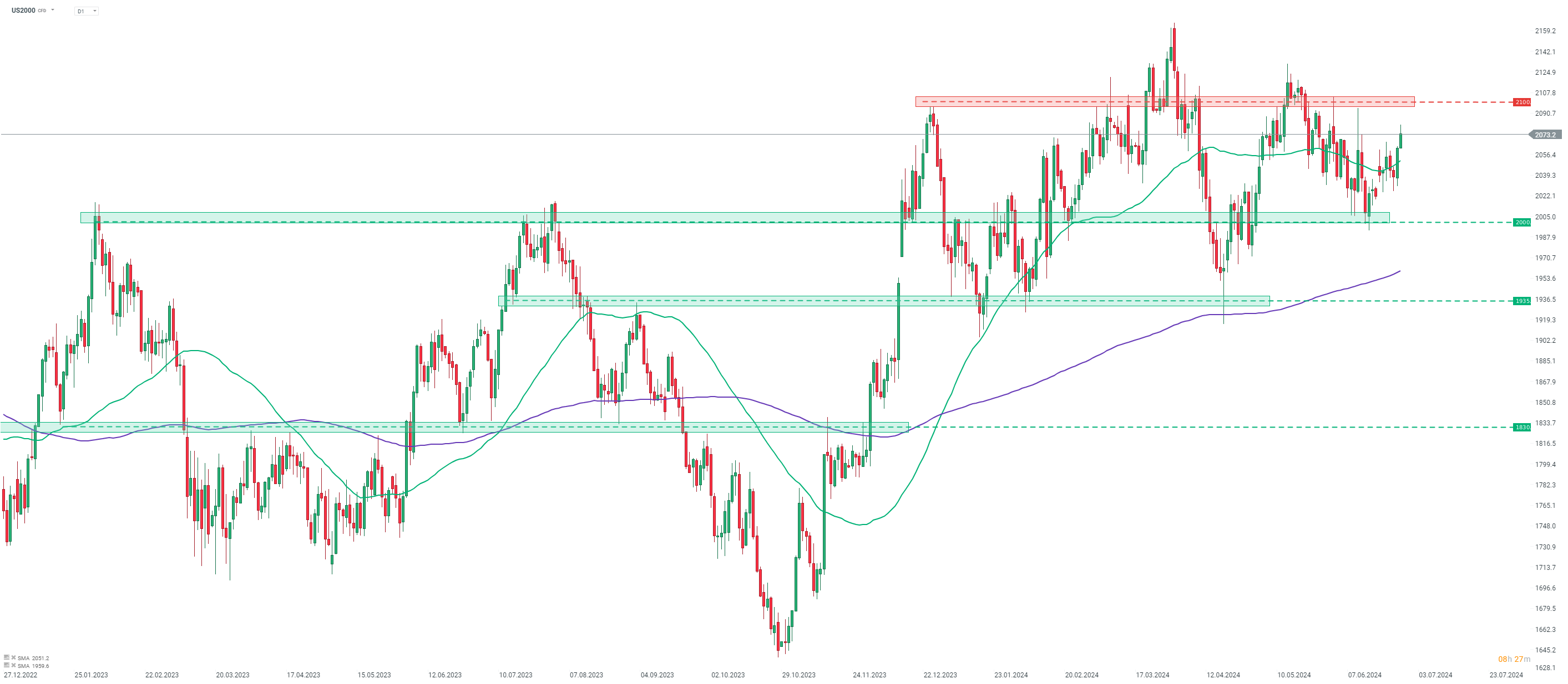 Le Russell 2000 est l'indice de Wall Street le plus performant aujourd'hui. En examinant le graphique des contrats à terme sur le Russell 2000 (US2000) à l'intervalle quotidien, nous constatons que l'indice a stoppé son récent repli dans la zone de support située au-dessus des 2 000 points. Le US2000 se négocie actuellement plus de 4 % au-dessus des plus bas quotidiens du 17 juin 2024 et au plus haut niveau depuis le 12 juin 2024. L'indice approche de la zone de résistance des 2 100 points, testée à plusieurs reprises récemment et considérée comme la limite inférieure de la fourchette de négociation de cette année. Un franchissement de cet obstacle ouvrirait la voie à un test des plus hauts de cette année, autour de 2 160 points.