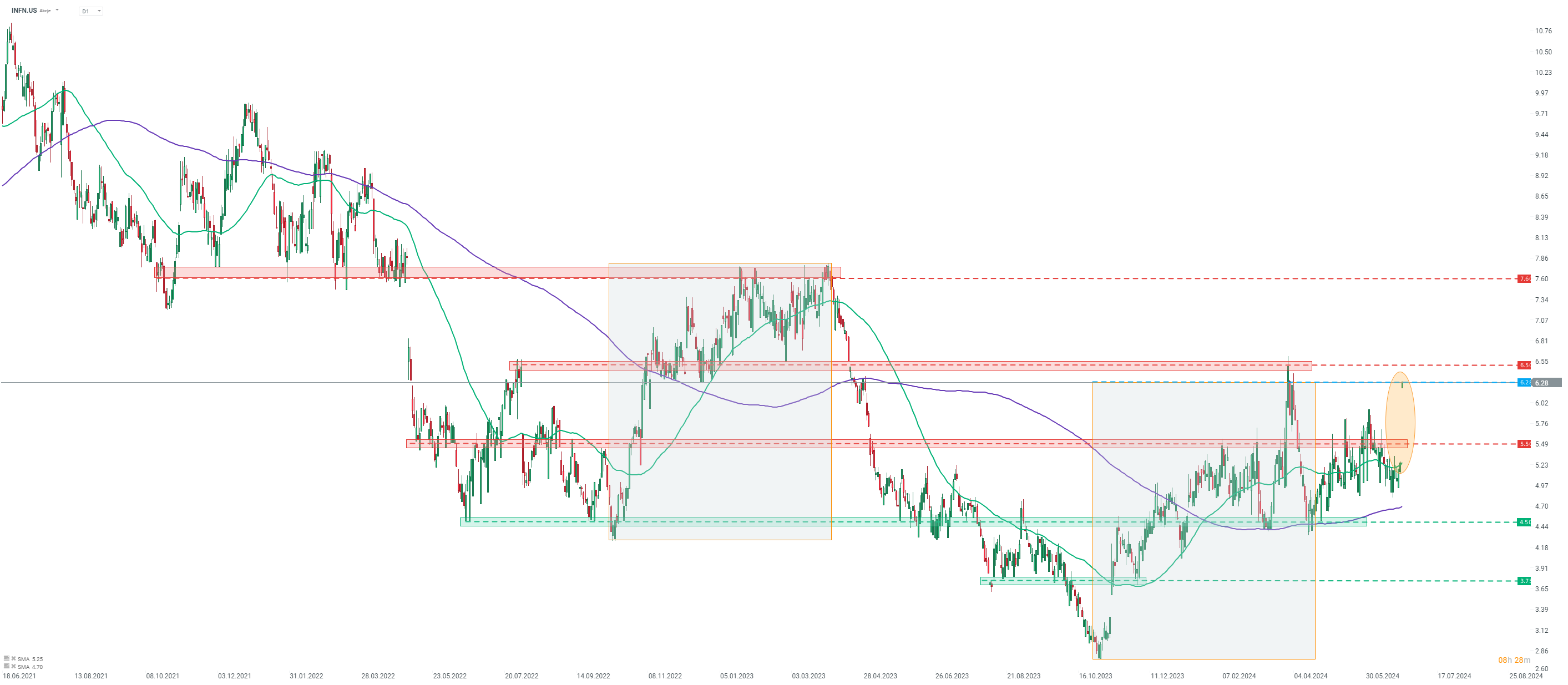 Infinera (INFN.US) a lancé la séance d'aujourd'hui avec un grand écart haussier après l'annonce de son acquisition par Nokia. Source : xStation5